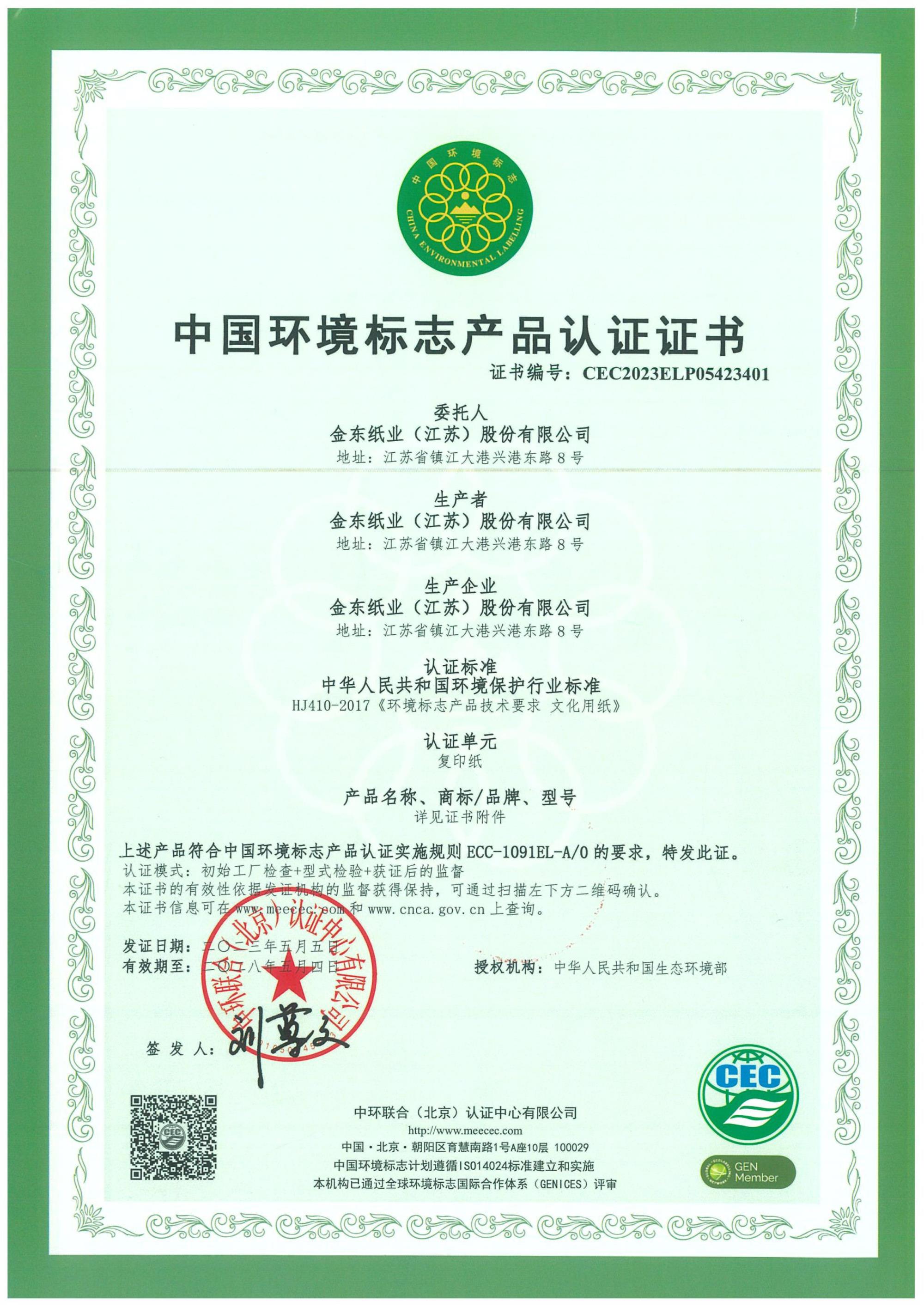 2023年4月 金东纸业顺利通过中国环境标志产品认证