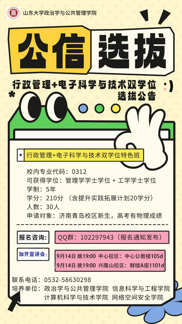 请于9月15日晚上22点前将报名表和相关证明材料发送至邮箱[email protected](邮件以“姓名+原学院+公信双学位”命名)。报名同学请加入QQ群(群号:102297943)进行详细咨询,后续通知也将在群里发布。招生小组将根据报名材料进行审核并择优确定笔试+面试人选,面试重点考查专业兴趣、英语水平和综合素质。