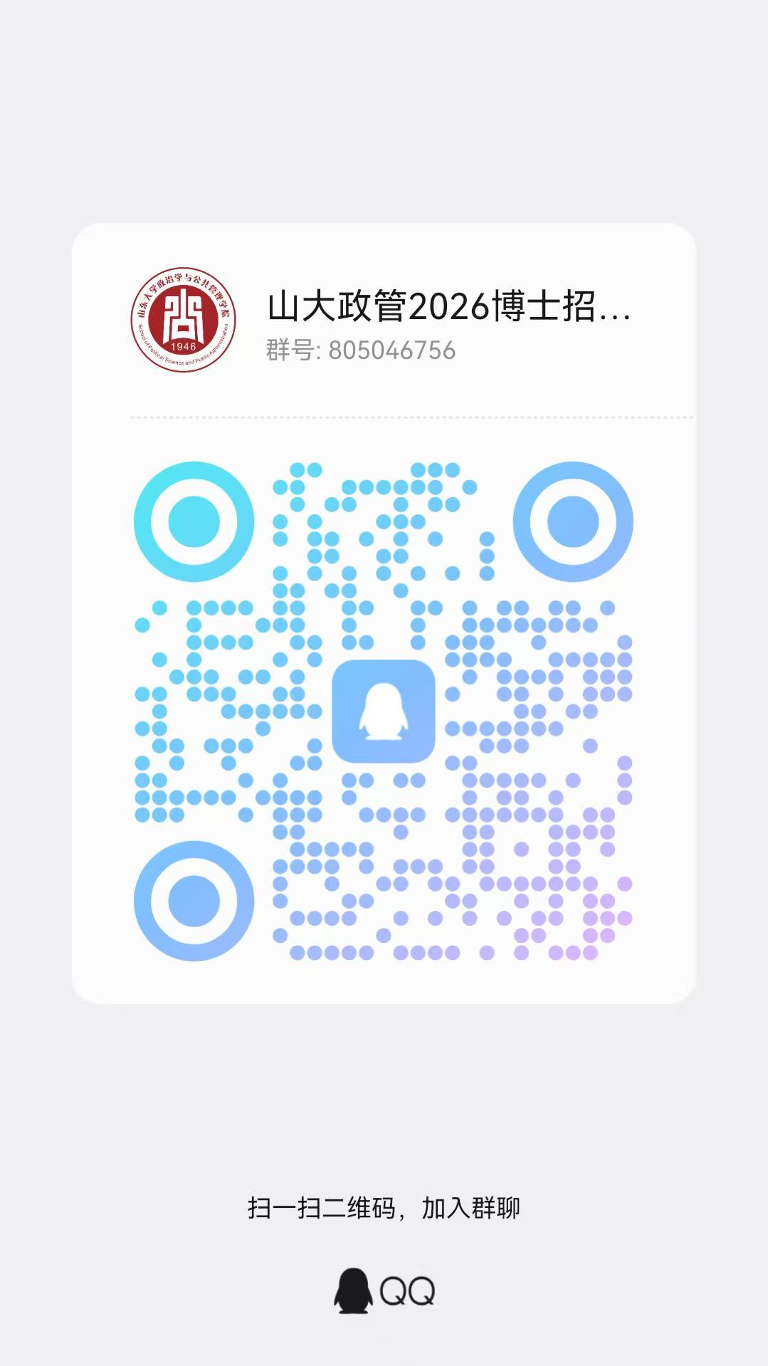 学院将组建考试QQ群(群号805046756,二维码附后)。该群仅限进入初试(笔试)的考生本人进入(名单以学院公示名单为准),入群请提供“考生姓名+报考专业+考生身份证号码后六位”以等候验证。进群后,所有考生应将“群昵称”修改成“姓名+报考专业”。待所有考生入群后,我院将正式启用QQ群发布消息,请考生时刻关注群通知。