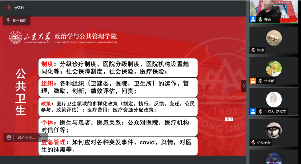 首先,郑涵简单介绍了社会实践的分类,并根据他个人的经验就如何选择社会实践的类别提出了相关建议。随后,郑涵从调研前、调研中和调研后三个阶段入手,详细阐述了社会实践的调研过程和每个阶段的注意事项。接着,郑涵以公共卫生这一具体案例为例,将公共卫生剖解为制度、组织、政策、个体和应急管理五个模块,从不同角度详细说明了社会实践丰富的研究主题。郑涵强调,社会实践应采取恰当合适的调查方法,讲求实事求是,避免结论的过度夸大。最后,郑涵推荐了相关书目和文献检索常用软件,并对同学们的提问进行了一一解答。讲座取得了圆满成功。