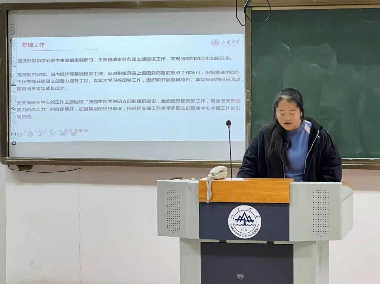 其次,学院学生会团支部服务中心解依桐对团支部服务中心的工作和职能进行了系统介绍。解依桐指出,团支部服务中心紧紧围绕“加强学院学生团支部的组织建设,全面活跃团支部工作”的服务宗旨,负责协助学院各团支部建设工作,实现团建的制度化和规范化。