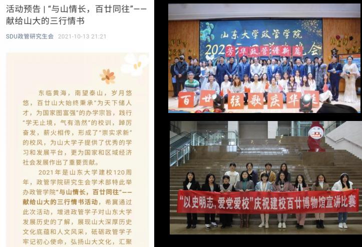 6、在建党百年,建校百廿之际,学院开设党史微党课、百廿校史微课堂、鉴往知来“政”当其时等原创栏目,通过积极发挥融媒体在网络思政中的独特作用,鼓励政管学子了解建党百年风雨、深挖建校百廿故事,传承优良的革命传统和充实求新的山大校风。