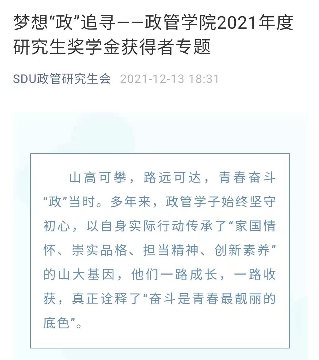 过去的2021年,政管研究生学以致用、知行合一,以朝气蓬勃的精神面貌在学习和工作中取得了诸多成绩,获得了多项奖学金和荣誉称号。