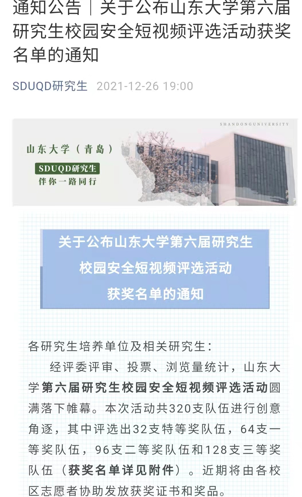 第六届研究生校园安全短视频评选活动中,我院获一等奖、二等奖团队各1支,共有21支团队获三等奖;
