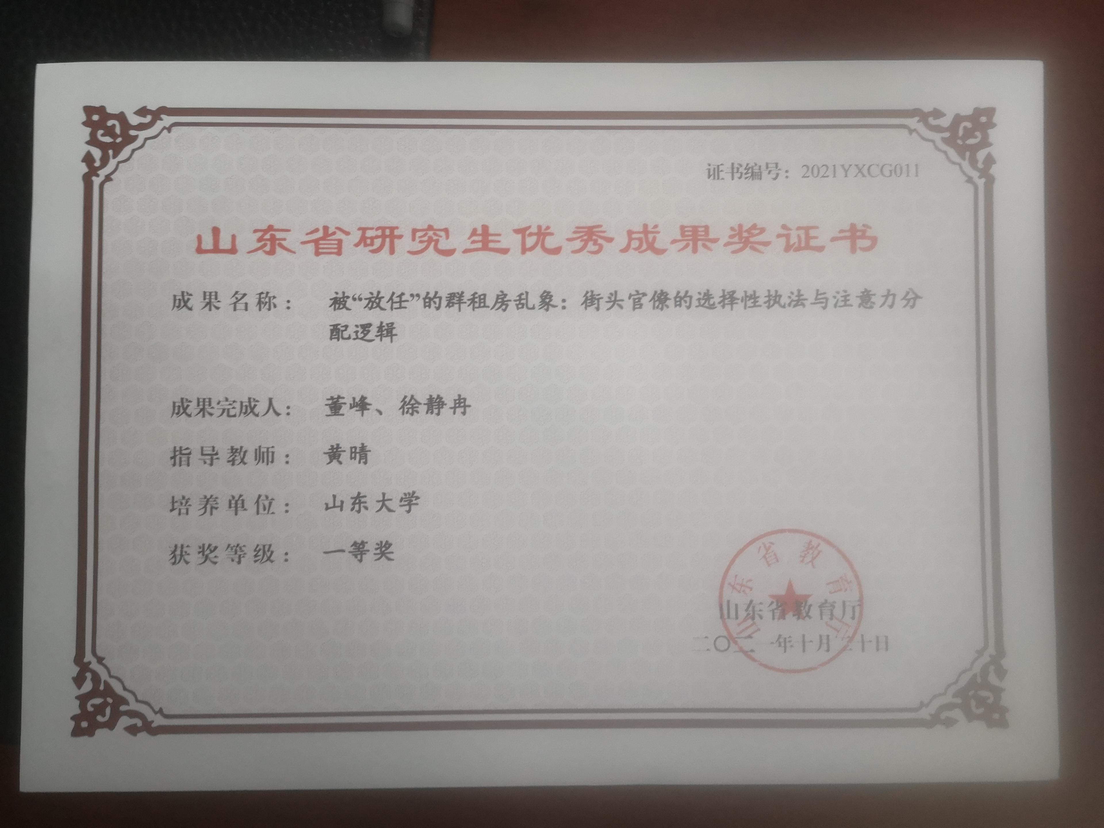1、董峰、徐静冉撰写的《被“放任”的群租房乱象:街头官僚的选择性执法与注意力分配逻辑》获得山东省教育厅研究生优秀成果奖一等奖;边琦撰写的《危机管理中的符号与仪式:以新冠疫情防控为例》获得山东省教育厅研究生优秀成果奖二等奖;