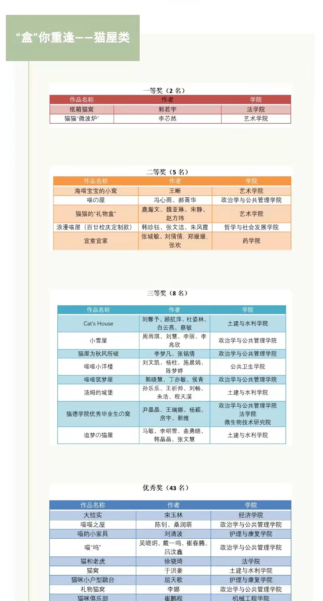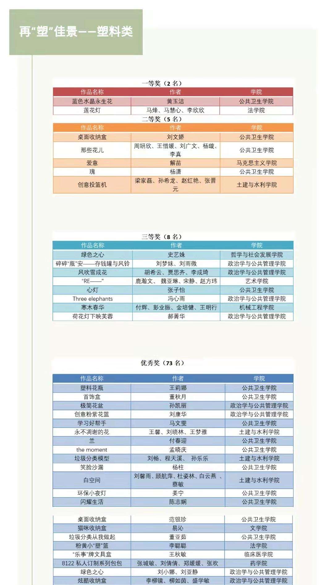 研究生第二届环保创意比赛中,我院冯心雨团队获二等奖,周雨琪团队、郭晓慧团队等8支团队获三等奖,陈钊团队、吴晓玥团队等34支团队获优秀奖;