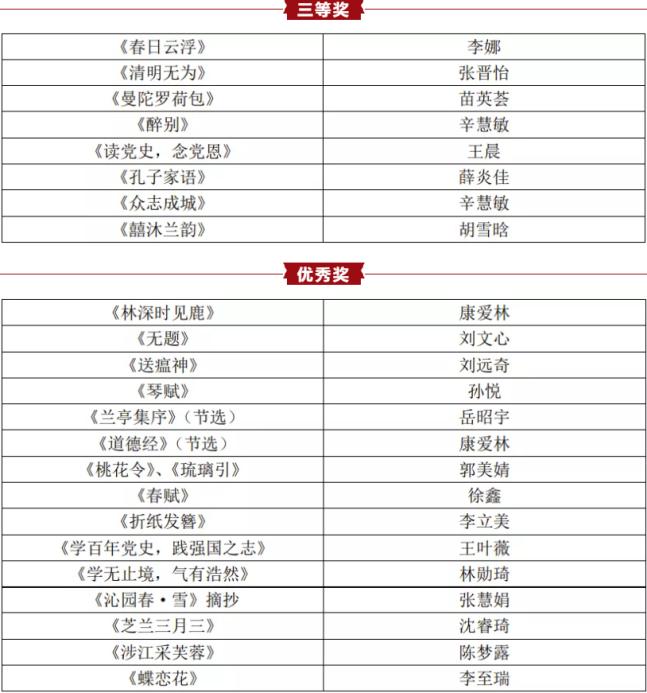 第四届“百年华诞,向党献礼”研究生线上书法大赛中,我院苗英荟同学获二等奖,孟雪迪、刘亚静同学获三等奖;在69成人小说