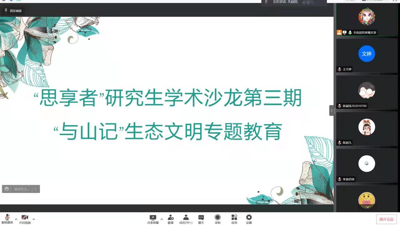 研究生会学术部举办了“与山记”生态文明专题教育活动。本次活动采用线上方式开展,活动吸引了116名同学在线参与,90余名同学通过小程序打卡分享心得体会。本期“思享者”活动以“我与山青同行同往,绿色校园共建共享”为主题,翟继航、尹晶晶、李柳镜、张学结、傅健菲五名同学向大家进行了分享。