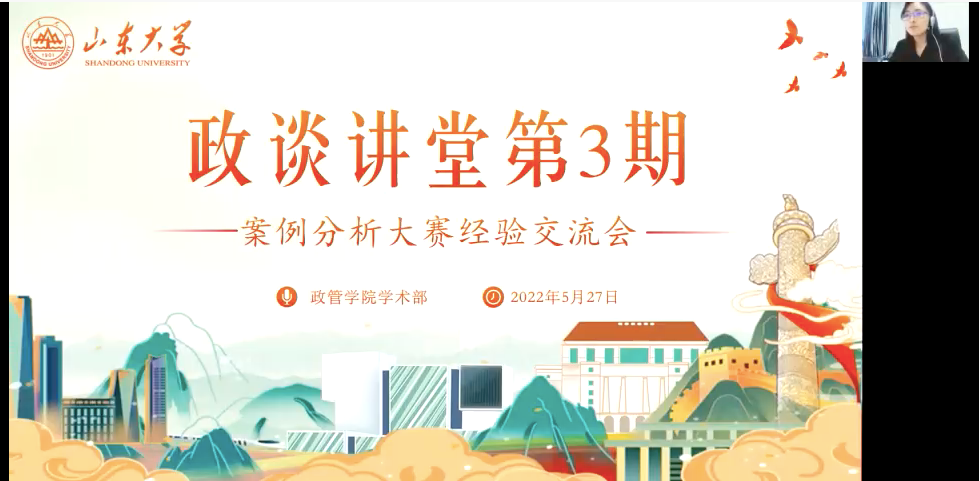 2022年政谈讲堂第3期——“案例分析大赛经验交流会”于线上成功举办。本次讲座由学院学生会学术部承办,学院常务副院长马奔出席讲座并发表点评,清华大学中国公共政策案例分析大赛一等奖获得者徐雅静、付晓彤出席并担任主讲嘉宾。讲座由学院团委书记于玲主持。