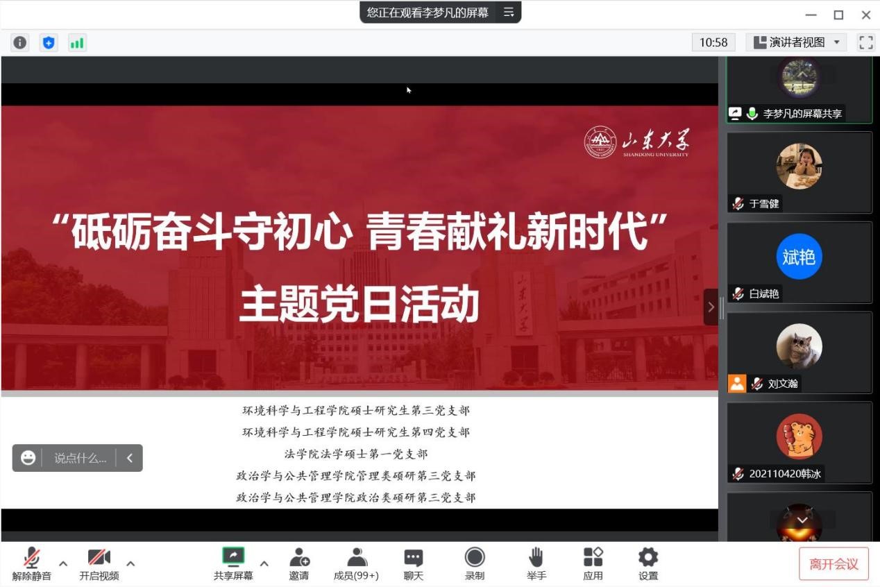 管理类硕研第三党支部、政治类硕研第三党支部,环境科学与工程学院硕士研究生第三党支部、硕士研究生第四党支部,法学院法学硕士第一党支部五个支部联合开展“砥砺奋斗守初心,青春献礼新时代”主题党日活动,邀请榜样模范交流座谈,共同进行理论学习,以实际行动迎接党的二十大胜利召开。活动由69成人小说