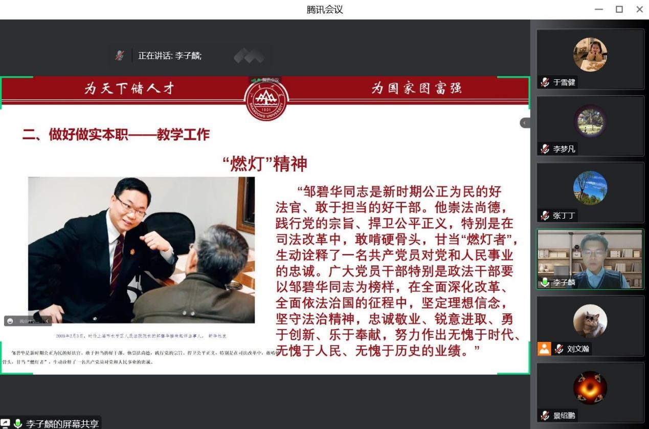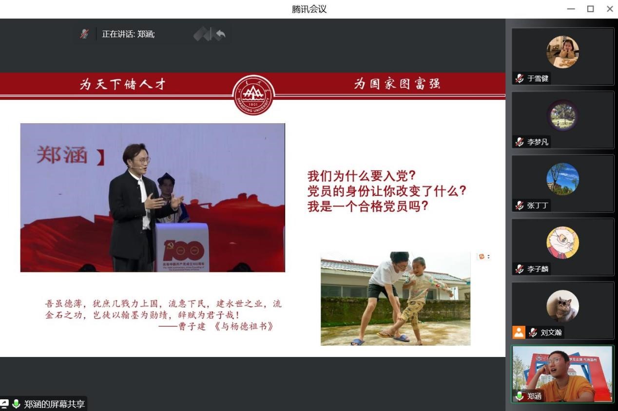 (青岛)团工委兼职团干部郑涵以《不要丢了精神》为主题,从“同志你好”、道德风尚奖获选心得、个人感受三个方面进行了分享,他讲道:“不要丢了精神,做一个合格的山大人,做一个合格的共产党员”。郑涵讲述了参与制作校史话剧《风雷振声》、毕业歌《山海等风》,“挑战杯”项目《寻访青岛红色足迹》等的心得体会,他在不同领域、用不同形式讲述山大故事,传承红色基因,让与会人员感受到了前人风采和山大精神。