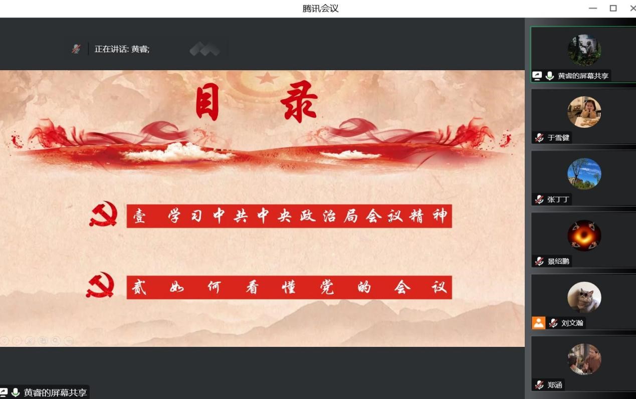 第二阶段,环境科学与工程学院硕士研究生第四党支部书记黄睿进行理论领学,黄睿同志以《如何看懂党的会议》为题,从学习中共中央会议精神、如何看懂党的会议两个方面,带领大家一起梳理党的会议,回顾党的重要会议精神。与会人员结合自身思想认识和生活实际交流了学习体会。大家一致表示要感受初心使命、汲取信仰力量,努力将学习感悟转化为奋斗前行的实际行动。
