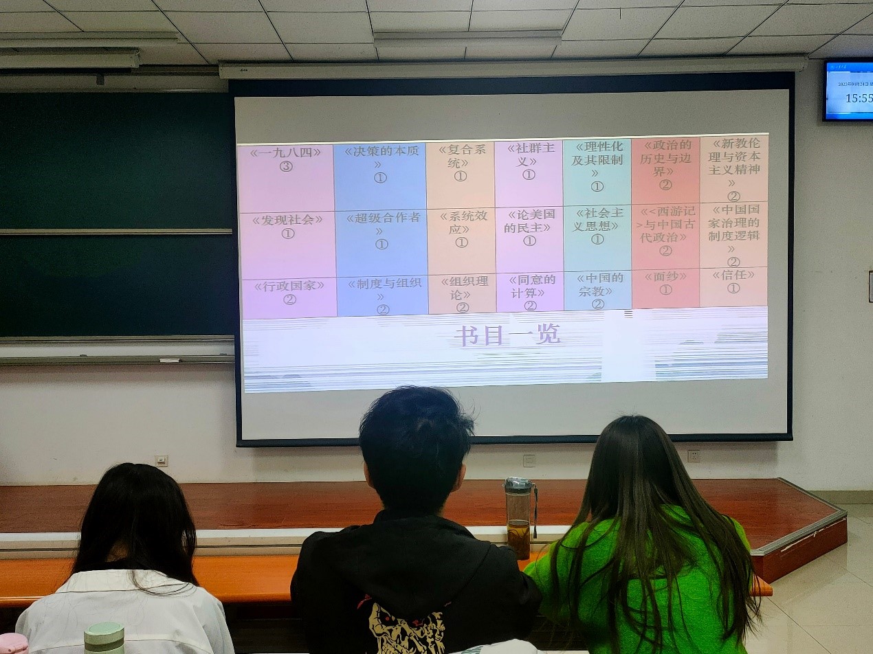 4月23日上午11时,21级行政管理二班读书漂流重启仪式在班长和学习委员的组织下如期举行,活动以“树立崇高理想,涵养浩然正气”为愿景、以“点亮读书灯,一身都是月”为主题,将培养班级同学爱读书、读好书、善读书的阅读习惯作为活动一以贯之的目标。系统地向同学们介绍了班级已有和新购入的书籍,其中包括《论美国的民主》、《新教伦理与资本主义精神》、《决策的本质》等书目。积极鼓励和倡导同学们向负责班委借阅,并以月为单位进行书籍的回流与交换,定期汇总读书随笔、集中进行线上展示和线下交流,推动班级共建共享文化风气的形成。