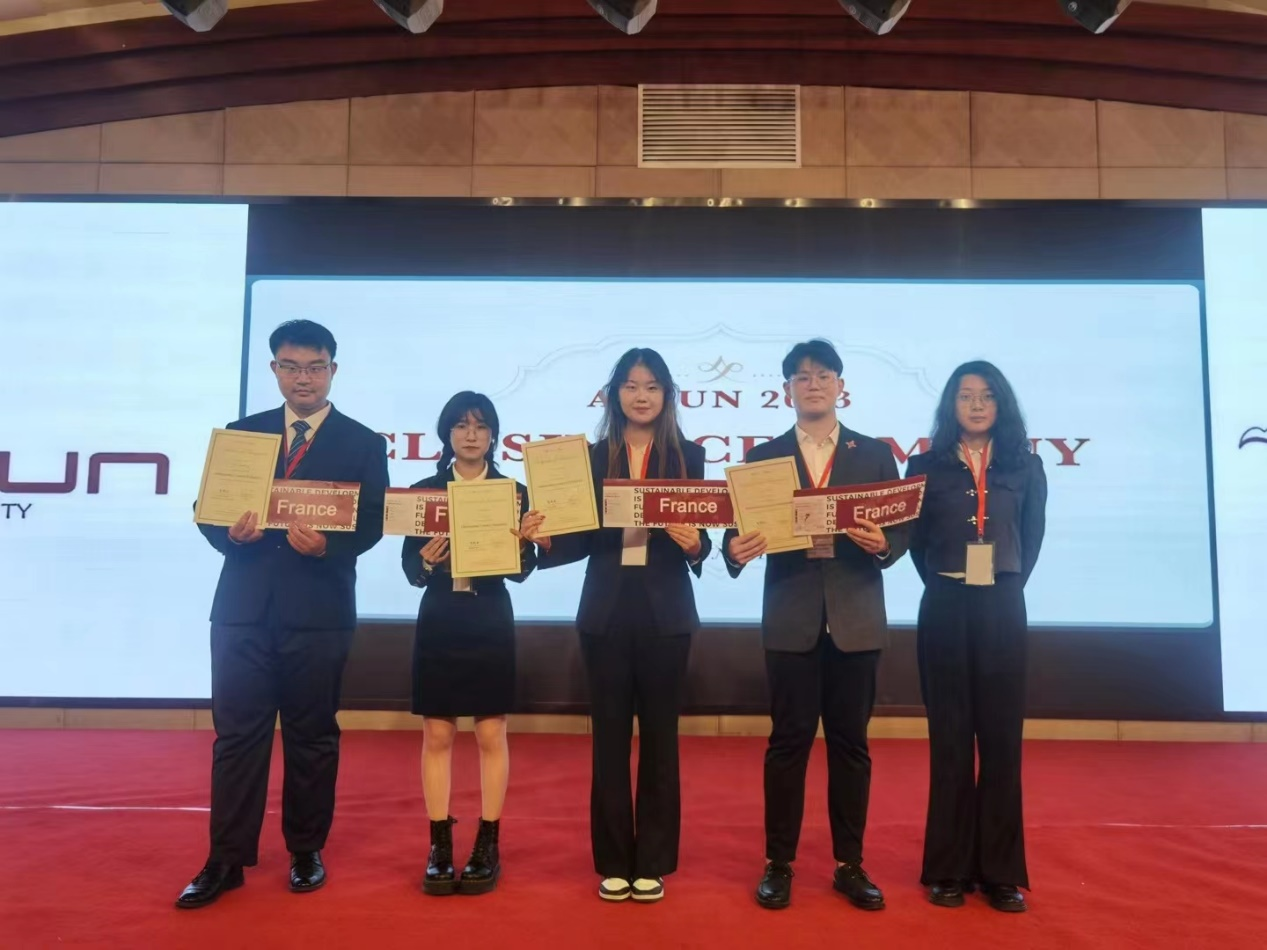 学曲子寰、李永昌和外国语学院学生李佳萱、宋若雨和黄琳雅,其中曲子寰和李永昌、李佳萱和宋若雨分别获得杰出代表团奖项。
