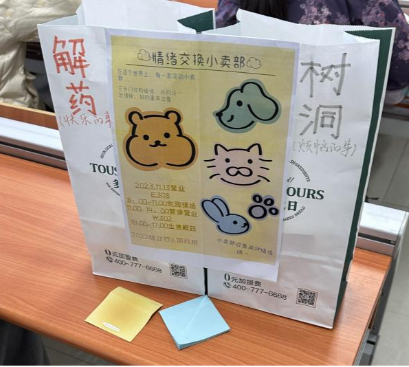 从通知消息到流程设计,活动尽力打造出小卖部情景,充分利用课间,在教室后排桌子放置了写有“树洞”和“解药”标识的两个纸袋,分别用于盛放大家的坏心情和好心情。