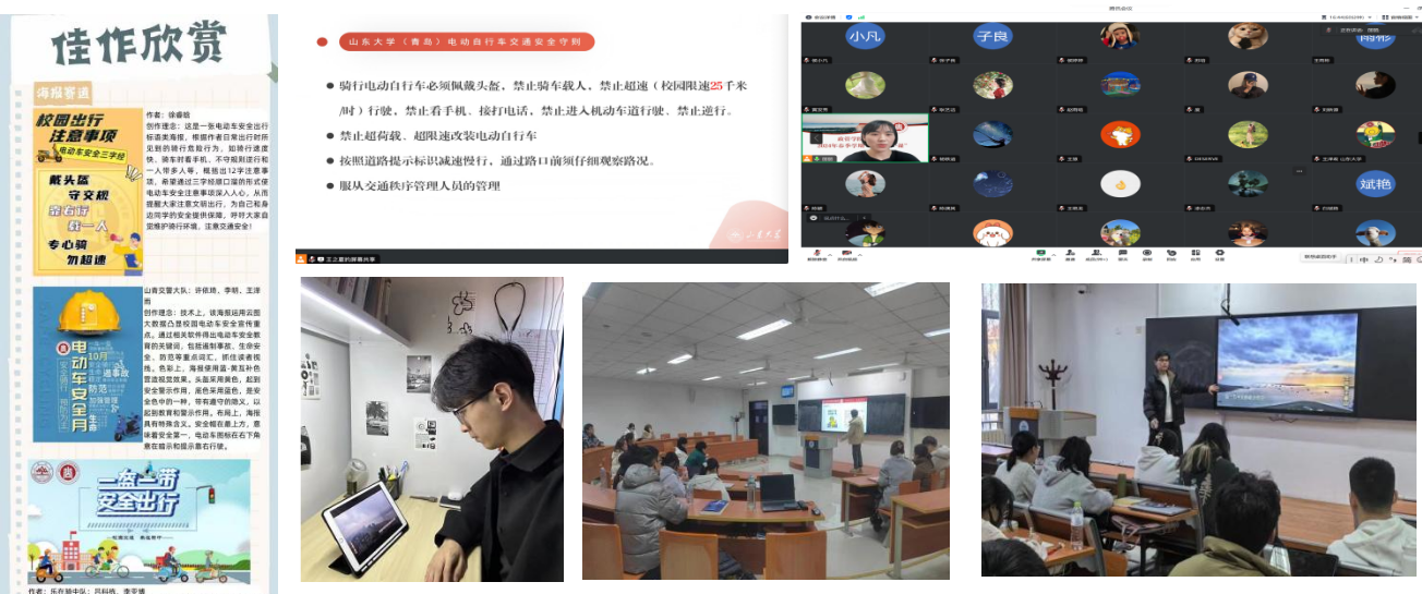 电动自行车管理办法(试行)》《电动车安全隐患防范警示提醒》宣讲,做好电动车管理“五个一律”解释工作,结合前期“安全骑行、平安校园”主题活动,进行优秀网络视频作品、设计海报和文创展演工作,引导学生争做校园安全的宣传者、践行者和守护者。组织各年级学生观看《生命重于泰山》《红线》等宣传教育片,进一步了解安全面临的严峻形势,深刻汲取教训,拧紧安全责任这根弦。此外,为进一步拓展宣传范围,学院充分利用校园网、微信进行信息收集反馈,向学生普及安全等知识,同时利用展板、宣传手册等强化线下安全知识宣传,线上线下形成合力,不断提升教育的贴近性、针对性,推动形成“人人讲安全、事事为安全、时时想安全、处处要安全”的良好氛围,努力保障师生安全和校园稳定。