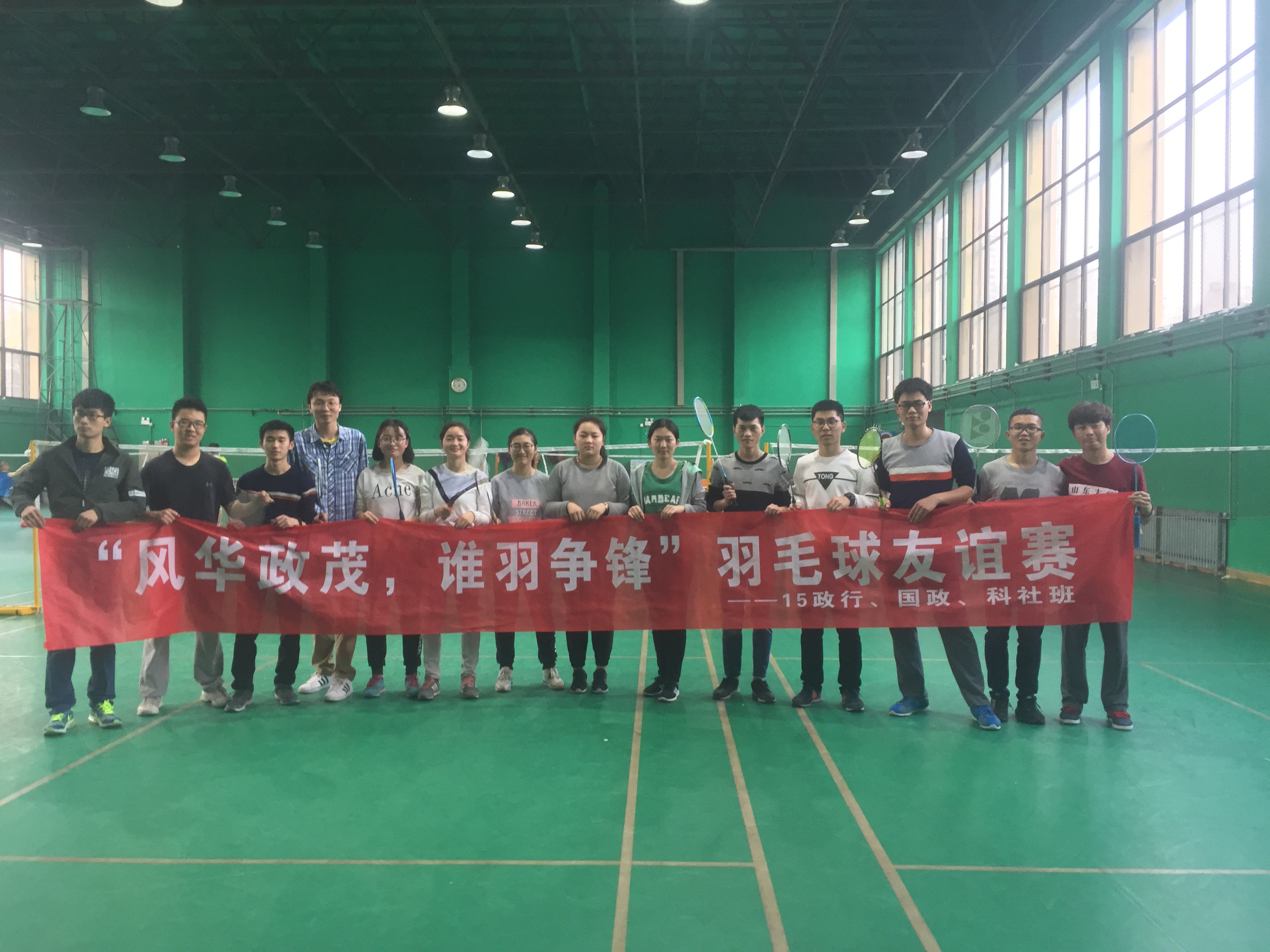 2015级政治学与行政学班、国际政治班和科学社会主义班在洪家楼校区体育馆联合举办了羽毛球友谊赛。