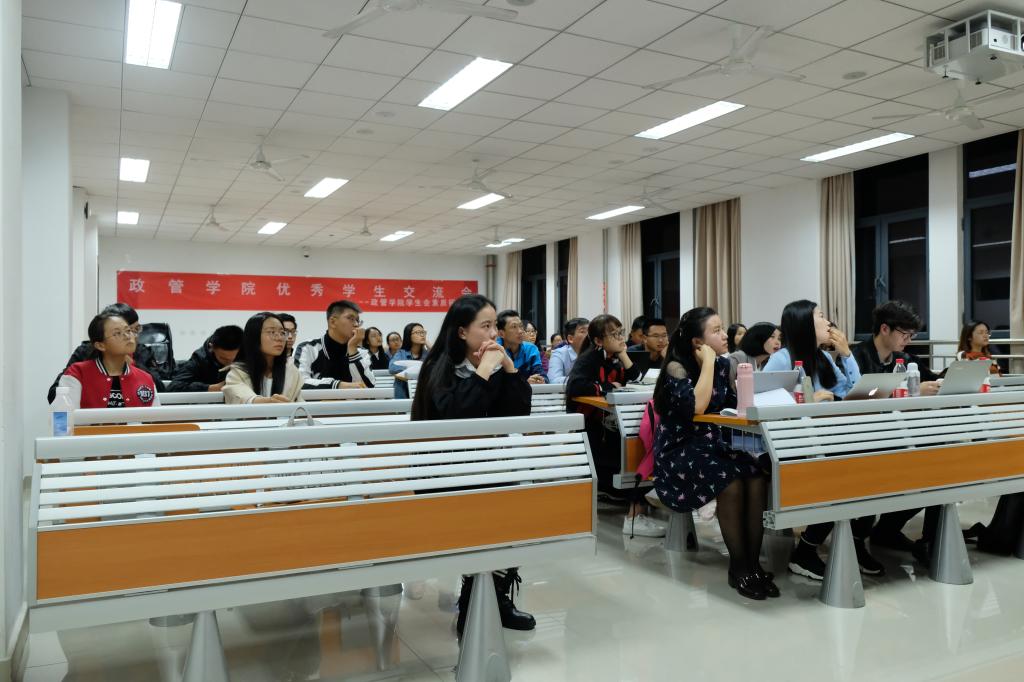 社会实践先进个人马天一就社会实践方面分享了经验,对社会实践的类型,过程以及考核进行了详细的讲解,让同学们对于社会实践有了更深入的认识。16级国际政治专业,国家奖学金获得者、校级社会实践先进个人孙宇飞以接地气的语言就如何做社会研究做了经验分享并通过有趣的案例和引用优秀学长学姐的话表明了自己对大学学习与政治学专业的见解,气氛活泼,激起了大家的思考。紧接着,16级政治学与行政学专业,国家奖学金获得者,社团和社会工作先进个人,社会实践与科研经历非常丰富的王浩瑜为在场同学分析了政治学专业的学科定位,学术科研,与其他学科的区分以及奖学金相关问题。最后,15级行管专业,69成人小说