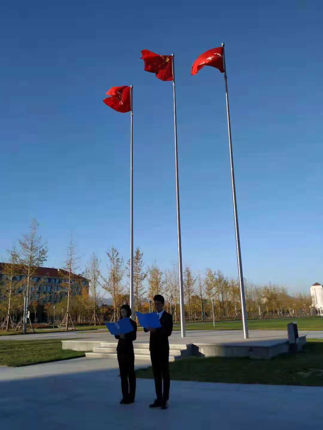 国旗班就位后,主持人宣布,升国旗,奏唱国歌。当雄壮激昂的国歌声响起,政治班全体同学行注目礼,国旗班全体同学行握枪礼,真挚的目光、庄重的面庞、静直的身体体现了同学们对国旗的尊重、满含着对伟大祖国的热爱。