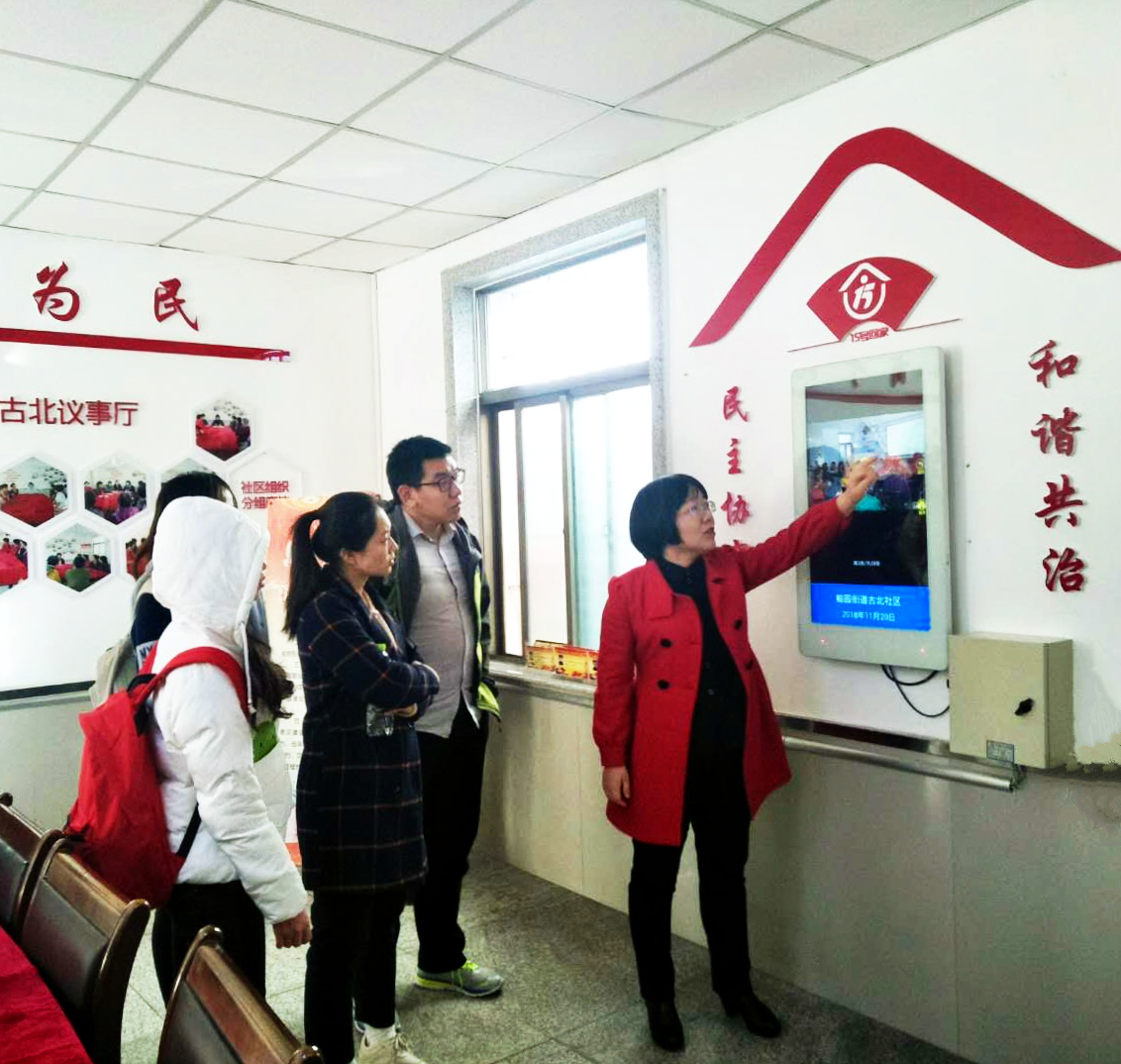 走进古北社区,几位居民正聚在一起,认真察看布置在街道两侧的宣传栏。“我们的工作成果都是真抓实干做出来的,每月定期更新,从不怕‘上墙’让大家看。”王书记向同学们介绍说。据了解,近年来社区党总支充分发挥网格无缝衔接的作用,借助多个楼道党小组和网格党支部的力量,开展 “双16党建课堂”“围炉夜话”“12系民行”等一系列活动,组织召开“民情恳谈会”“党群民主议事会”,把热心社区事务的党员、群众凝聚起来,形成了浓厚的“家社区”氛围。“习近平总书记讲‘党建的工作说到底就是做人的工作’,以前体会不深,现在看来的确如此。”张劲松同学边听边记,颇有感触。