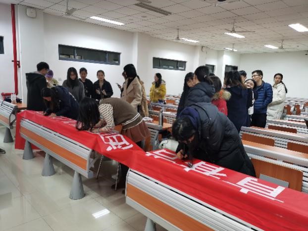 第四部分,班会接近尾声,团支书组织大家进行宣誓,重温入团誓词,大家在团旗之下拿起笔,于写有“青春告白祖国”六字的横幅上签上了自己的名字,郑重宣誓,告白祖国。结束后,大家一同前往博物馆前合影留念。