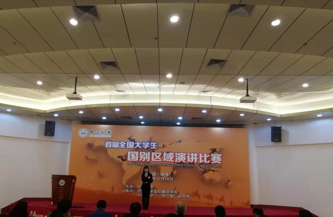 、北京大学、浙江大学、复旦大学、中山大学、北京外国语大学等多所著名高校的90位选手从170多位参赛者中脱颖而出,进入现场比赛环节。12月14日,首届全国大学生国别区域演讲比赛在中山大学珠海校区伍舜德国际交流中心举行。赵小辉同学的命题演讲围绕“‘一带一路’中的梦想”这一主题进行了题为《“一带一路”:照亮平凡、圆梦世界》的演讲,并以分赛场第一名的成绩进入决赛。决赛环节赵小辉以“大国特色外交”为主题进行三分钟即兴演讲并回答评委提问,见解独到,应对从容,最终获得本次比赛特等奖。学院党委副书记董雪梅老师荣获“优秀指导老师奖”。