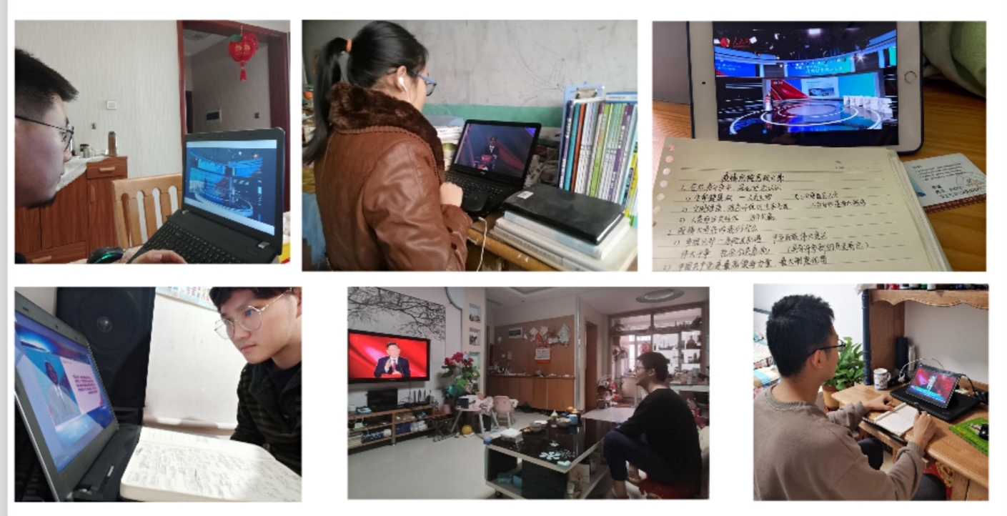 在思政大课视频直播结束后,我班还通过线上视频会议,进行了在线讨论,交流大家的学习成果,部分同学在观看直播时做了笔记,并在在线讨论环节同大家进行了交流。曹玉涛同学表示“通过思政大课他深切感受到在党和政府的决策部署,全国一盘棋,中国这个大家庭在疫情面前表现出来的果断与坚韧,体现严格要求中不乏人格理性的光彩。在这场疫情阻击战中,当代青年敢于担当,越来越多的90后、00后的身影出现在防疫一线。少年强则国强,少年智则国智。我辈青年需铭记历史,奋进前行,为国家全面建成小康社会增砖添瓦。”张铭倩同学表示“在党和国家的领导下,疫情得到了有效控住,工厂企业也在复工复产,而作为大学生的我们也要从自身做起,严格做到少出门,出门戴口罩,回家勤洗手,也要做到停课不停学,在家里规划时间,锻炼身体,好好学习。”