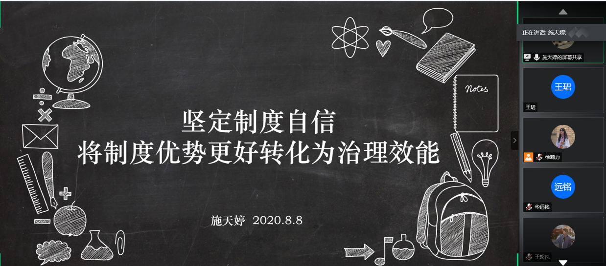 “山盟青声”线上关于绽放战疫青春·坚定制度自信理论宣讲团通过线上形式就中国特色社会主义制度优势相关内容召开第三次理论学习会议,本次会议由团队内两位党员肖峰与施天婷同学带领团队成员进行理论学习。