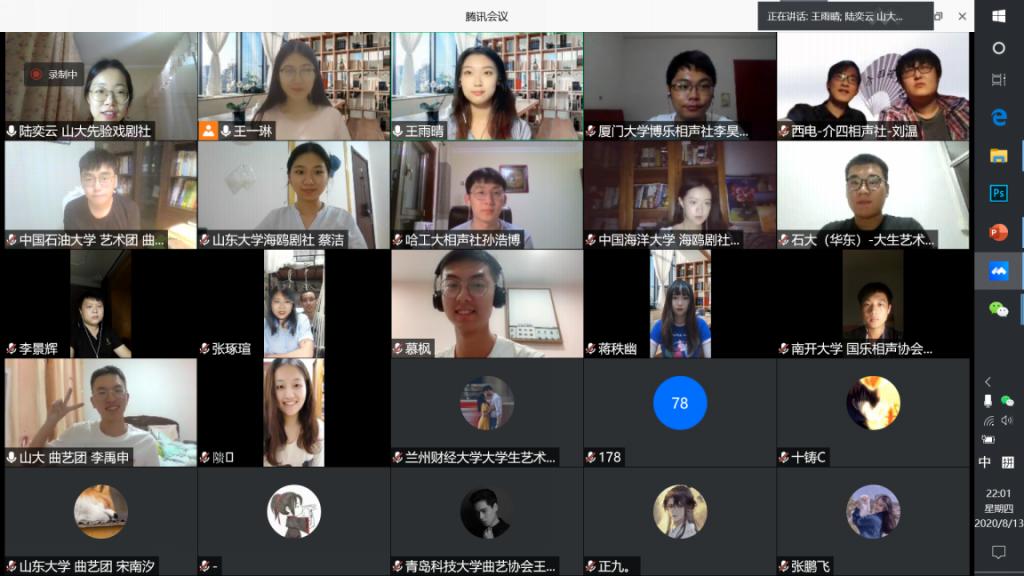 此次“云分享”围绕“以艺战疫,交流共享”的主题展开,旨在分享社团活动经验,精进业务,增进友谊,同时为疫情期间高校大学生艺术团体应如何为抗击疫情贡献力量进行探索。各校同学畅所欲言、各抒己见,就社团运营心得、文艺活动举办经验等方面展开积极讨论,活动氛围十分热烈。