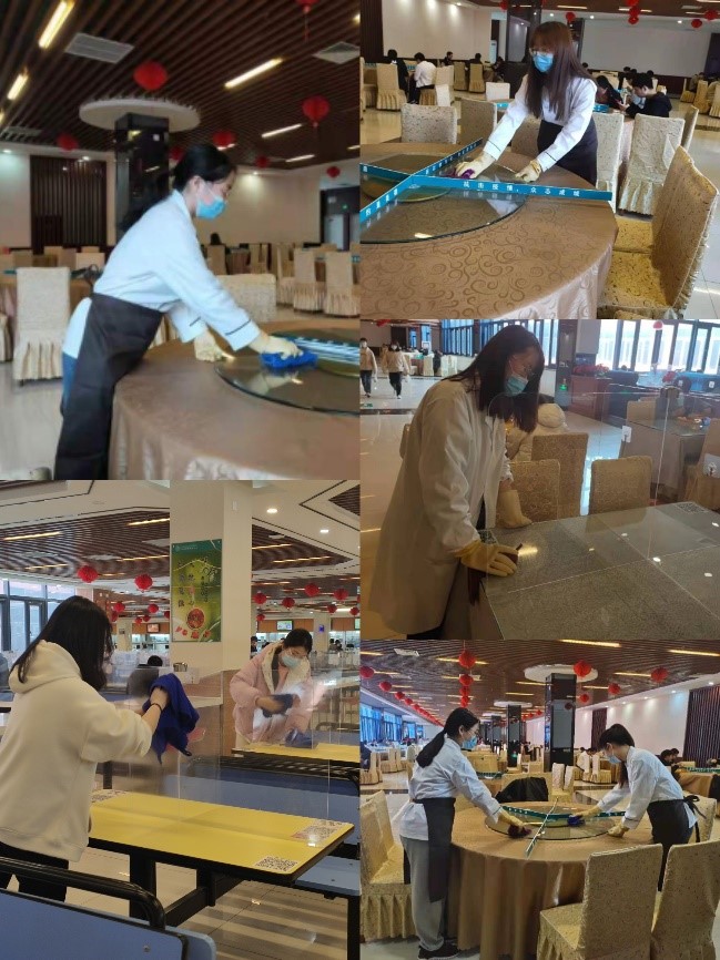 志愿者们身着白色防护服,戴好口罩,系上围裙,或是手拿抹布,细细擦拭每张桌子;或是戴上手套,微笑接过每个餐盘,认真负责,任劳任怨,默默付出,在餐厅的每个角落里,同学们能看见他们忙碌的身影。