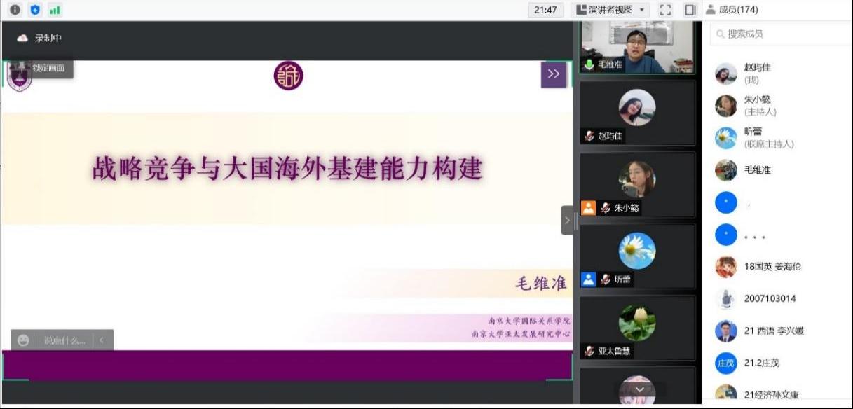 本次讲座中,毛维准教授将海外基建置于大国战略竞争的背景之下进行考察,通过丰富详实的图文资料呈现和条理清晰的分析与阐释向大家分享了关于这一课题深入而扎实的研究,增进和丰富了与会师生对于大国海外基建竞争的态势、特征、应对等方面的了解与认知,为理性、审慎地思考大国的国际公共产品供给与国际责任开拓了新的思路。