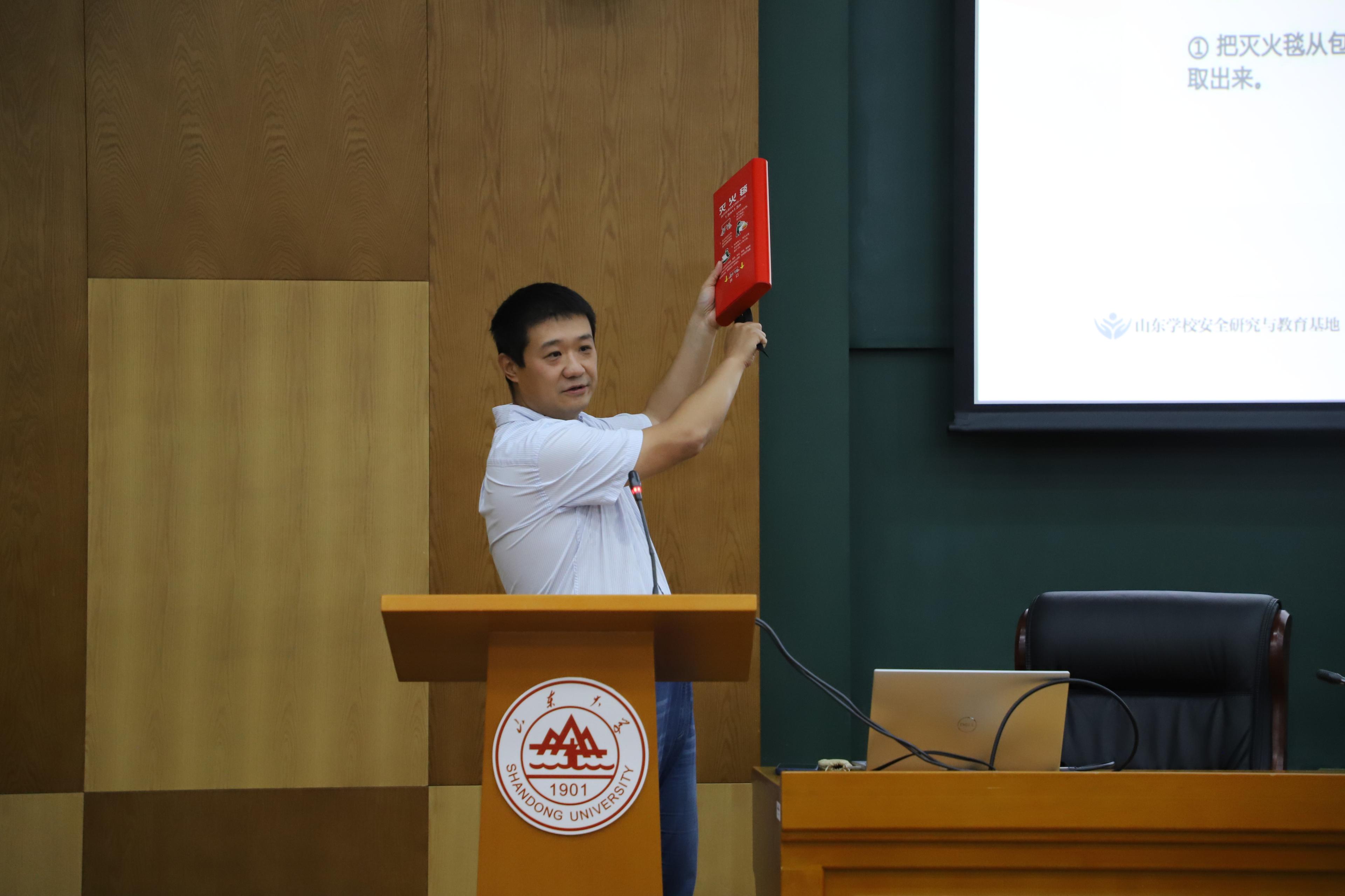 孙垚老师介绍了火灾的分类、消防设施、消防器材的使用以及火场逃生技巧,详细讲解了包括灭火器、灭火毯、消防栓、逃生面具以及逃生缓降器在内的各类消防器材的使用方式,并利用实物进行展示。同时他结合火灾的发展过程,指出火灾发生后的五大逃生误区,帮助大家迅速掌握逃生要点,并解答了师生的提问。