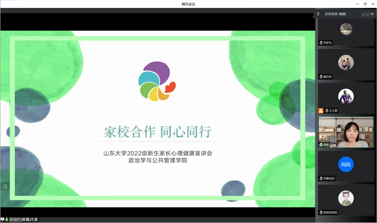 2022级新生及家长见面会于线上举行。学院党委书记盖玉强,常务副院长马奔,副院长刘昌明、党委副书记马桂兰、副院长朱贵昌、副院长赵婷,政治学与行政学系系主任李振,公共管理系系主任楼苏萍,团委书记于玲,辅导员臧丽丽以及2022级全体新生和新生家长参加此次见面会。会议由2022级辅导员王之夏主持。