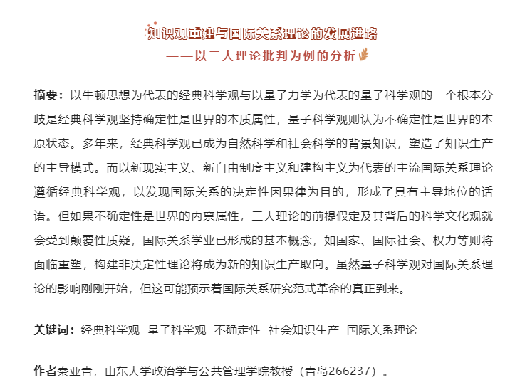 秦亚青教授所撰写《知识观重建与国际关系理论的发展进路——以三大理论批判为例的分析》一文在《中国社会科学》2022年第9期发表,这是秦亚青教授就“国际关系理论研究”发表的最新学术研究成果。
