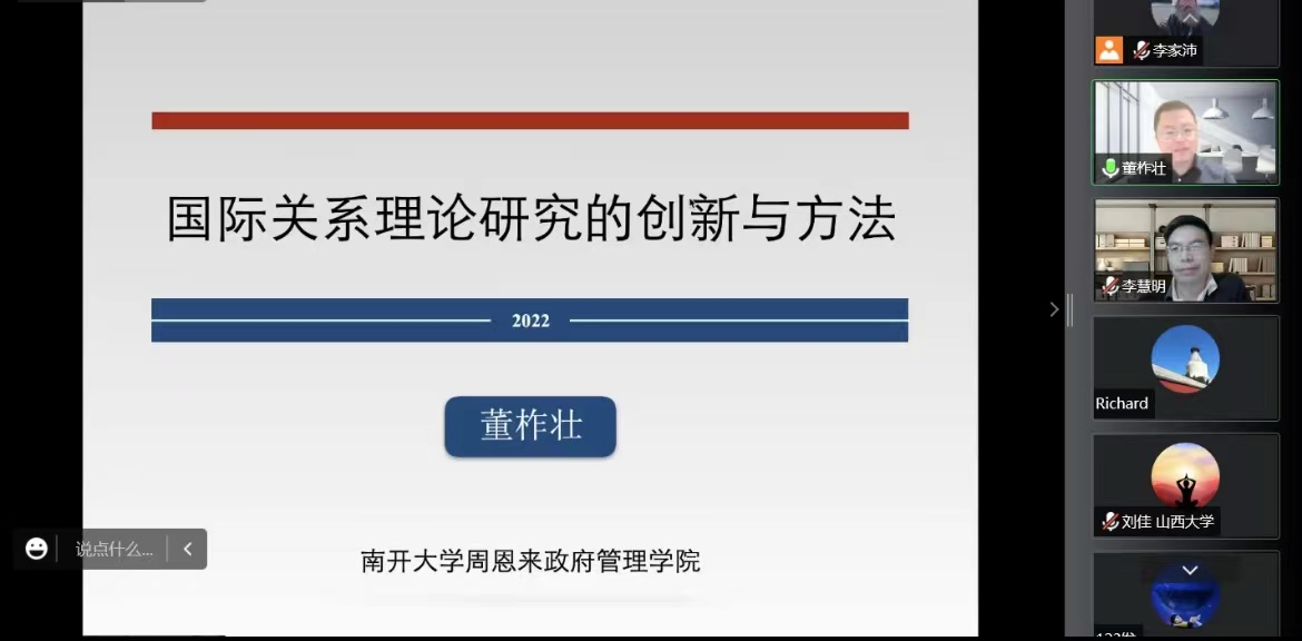 董柞壮从个人多年的研究经历出发,结合自身发表的学术论文,对国际关系理论研究的基本特征、实现路径和研究方法进行了详细讲述。在如何进行理论研究部分,董柞壮围绕因果机制、问题意识和方法论等理论研究的基本要素展开了分享。在讲座结尾,董柞壮结合自身的学术历程,鼓励大家积极进行学术积累、掌握多种方法、扎实学术功底,做出好的理论研究。最后,国政专业2022级博士研究生与董柞壮就分析框架处理、论文写作和方法选取等问题进行了交流。李慧明教授进行了总结。