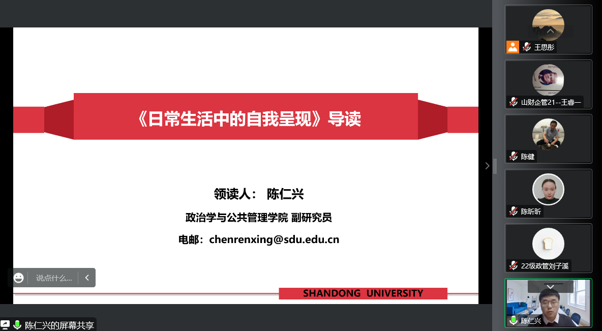 公共管理系本学期第四期“本本优本”读书会于线上举办。本期读书会阅读书目为《日常生活中的自我呈现》,由学院副研究员陈仁兴领读,吸引学院各年级三十余名本科生参与。