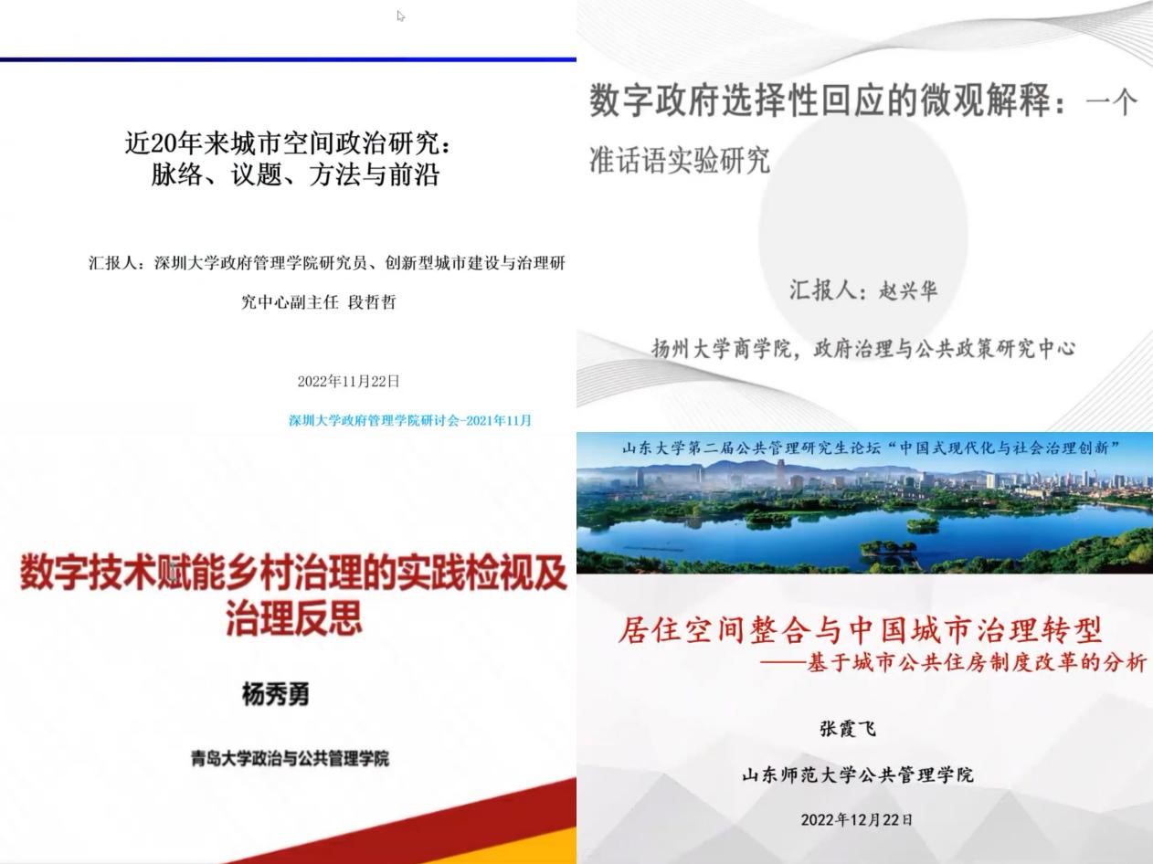 杨志老师主持主旨报告环节,深圳大学助理教授、研究员段哲哲、扬州大学商学院、政府治理与公共政策研究中心讲师赵兴华、青岛大学政治与公共管理学院助理教授杨秀勇、山东师范大学公共管理学院讲师张霞飞基于中国特色国情和现代化的共同特征分别做了题为“近20年来城市空间政治研究:脉络、议题、方法与前沿”“数字政府选择性回应的微观解释:一个准话语实验研究”“数字技术赋能乡村治理的实践检视及治理反思”及“居住空间整合与中国城市治理转型——基于城市公共住房制度改革的分析”的主旨发言,为社会治理领域的理论建设与实践发展提供了新的研究议题、视角与思路。