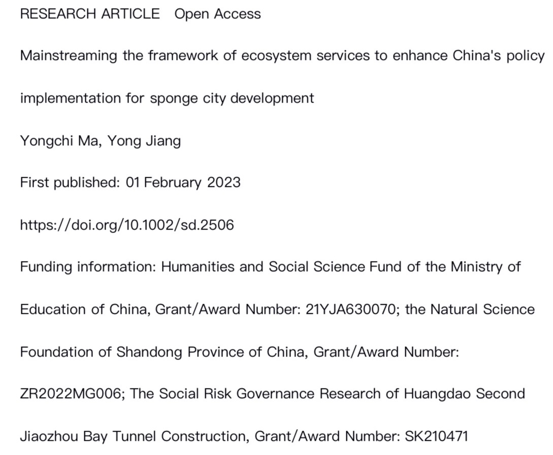 近日,马永驰教授的最新成果“Mainstreaming the framework of ecosystem services to enhance China's policy implementation for sponge city development”被SSCI期刊Sustainable Development(JCR一区&中信所一区)收录。