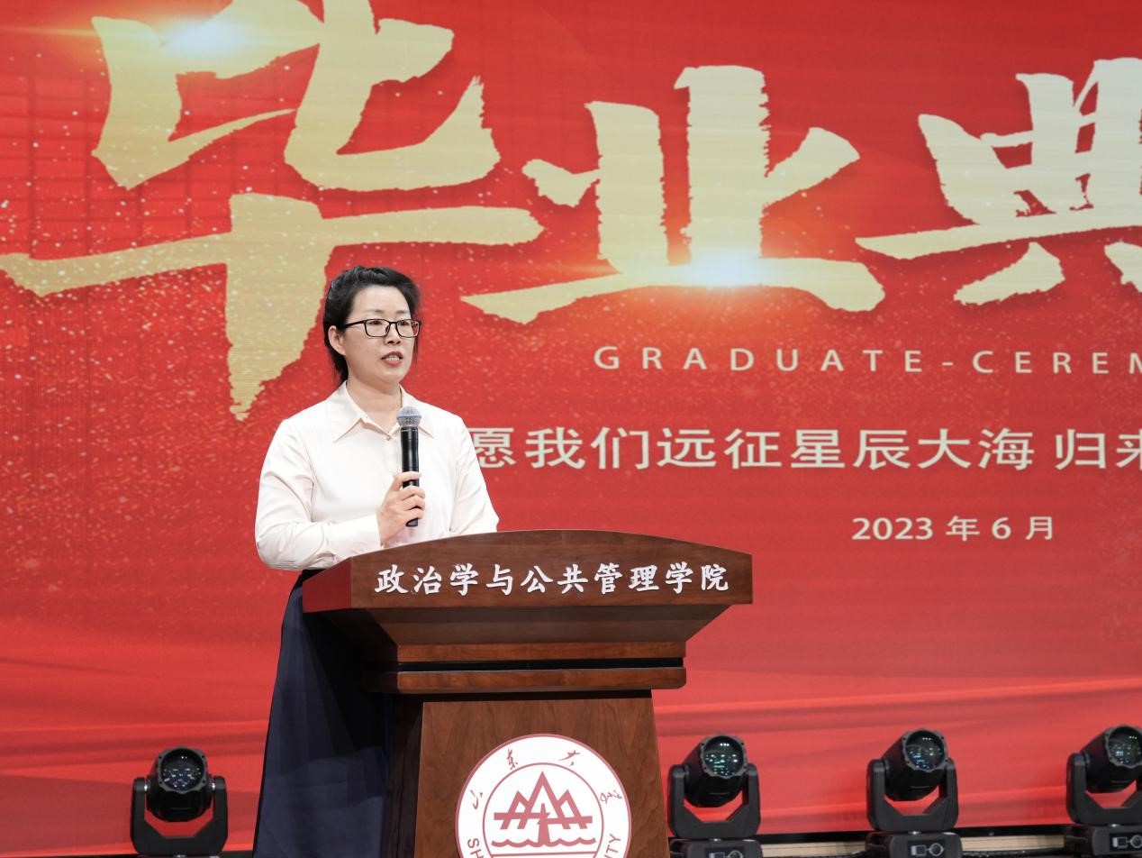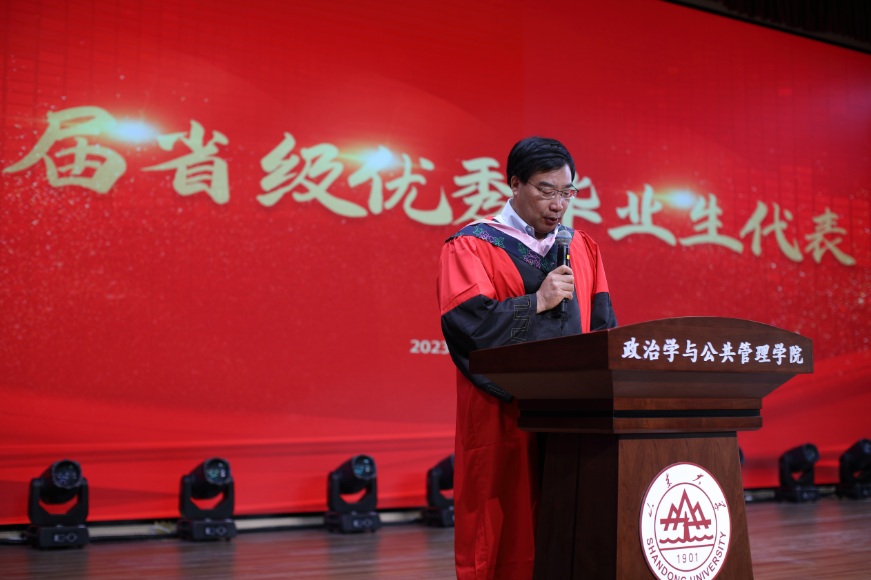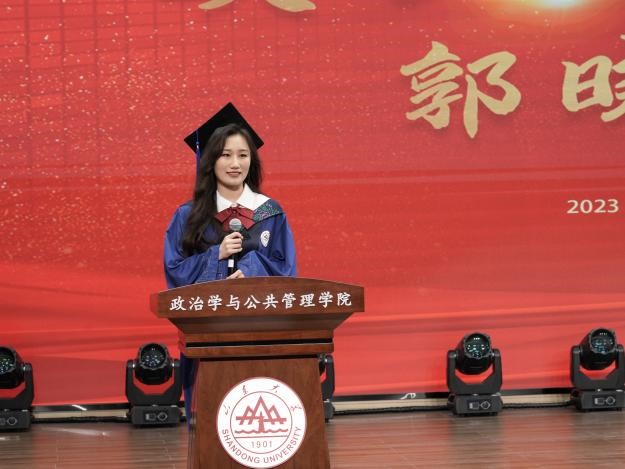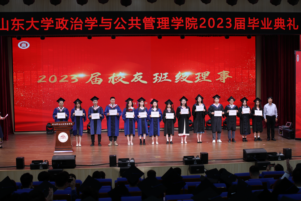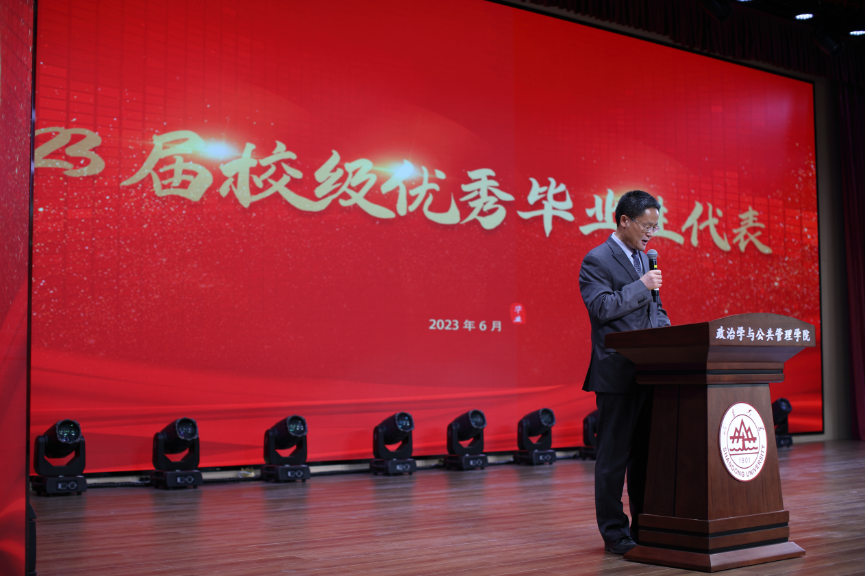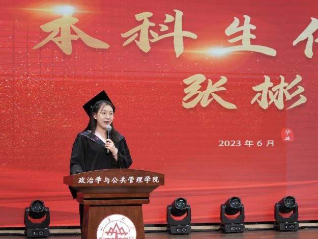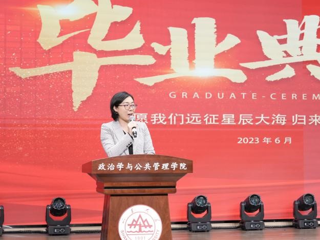 2023届毕业生毕业典礼暨学位授予仪式拉开帷幕。校友代表、现任教于上海交通大学国际与公共事务学院的苏若林副教授,回顾了在校学习生活的美好时光,向母校表达了由衷感谢并向全体毕业生表达了诚挚祝福。随后本科生代表张彬、硕士研究生代表郭晓慧和刘硕、MPA代表李振茜和博士研究生代表王昭先后发言,表示将牢记母校“学无止境,气有浩然”的校训,不负“知政为公,厚德笃行”的殷切嘱托,到新时代新天地中去施展抱负、建功立业,争当伟大理想的追梦人,争做伟大事业的生力军,让青春在祖国和人民最需要的地方绽放绚丽之花。