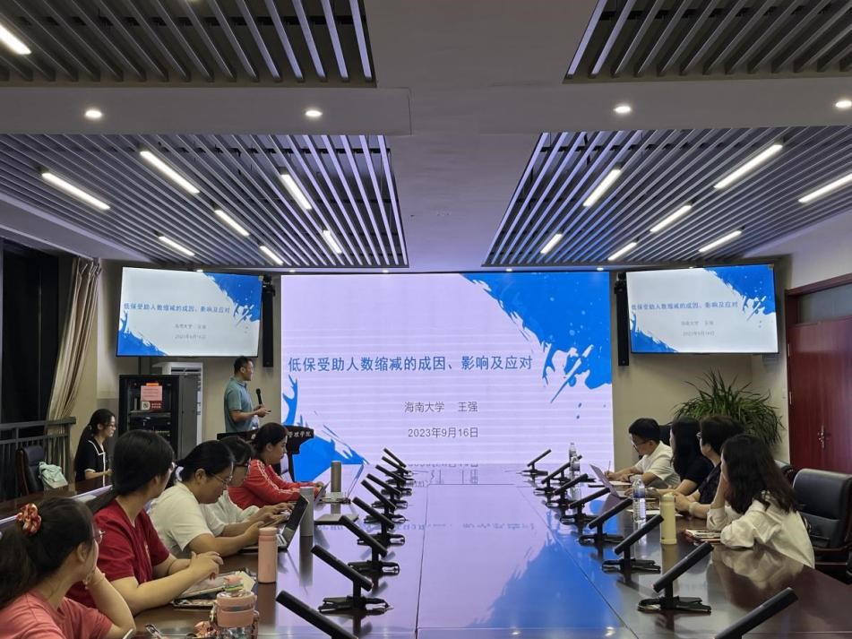公共管理系2023-2024学年秋季学期第二期望远青年学者沙龙于华岗苑南楼四楼中厅会议室举办,讲座主题为《最低生活保障受助规模持续缩减的成因、影响及应对》。本次讲座由海南大学公共管理学院王强副教授主讲。学院陈仁兴副研究员主持讲座。