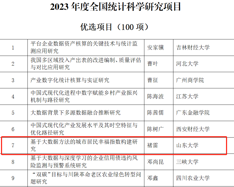 日前,全国统计科学研究组织管理办公室公布了2023年度全国统计科学研究项目立项名单。69成人小说 生活质量与公共政策研究中心副主任、专任研究员李进涛的《新时代多层级乡村振兴统计监测研究—以山东省为例》、中心专任研究员褚雷的《基于大数据方法的城市居民幸福指数构建研究》获批优选项目。此次全国统计科学研究立项充分彰显了中心服务地方与决策支持的新型智库作用。