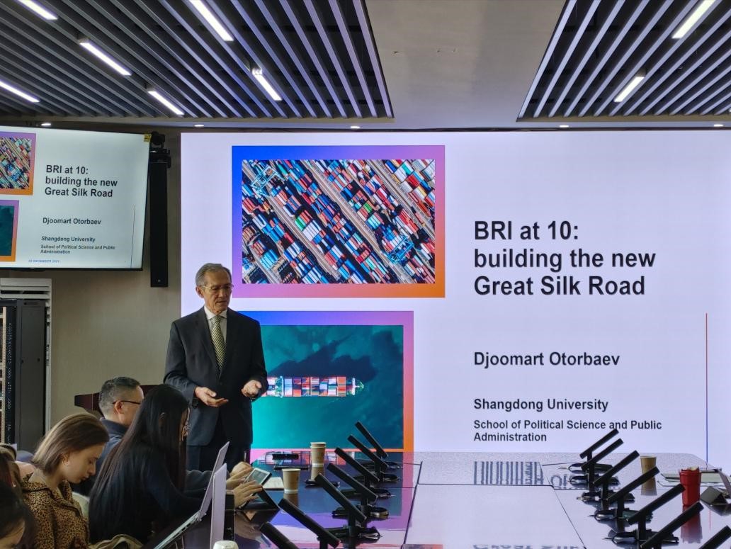 讲座伊始,Djoomart Otorbaev教授介绍了自己关注中国研究的原因。结合实际观察,他对全球化背景下“一带一路”倡议的必要性予以高度评价,强调十年来“一带一路”倡议成效显著,推动了中亚地区基础设施建设。中吉乌铁路即为典例:它在大大缩短中国与欧洲之间的距离的同时,也有力促进了地区双、多边贸易的蓬勃发展。盛力教授认为Djoomart Otorbaev教授为中国学者进行欧亚研究提供了不同的视角。