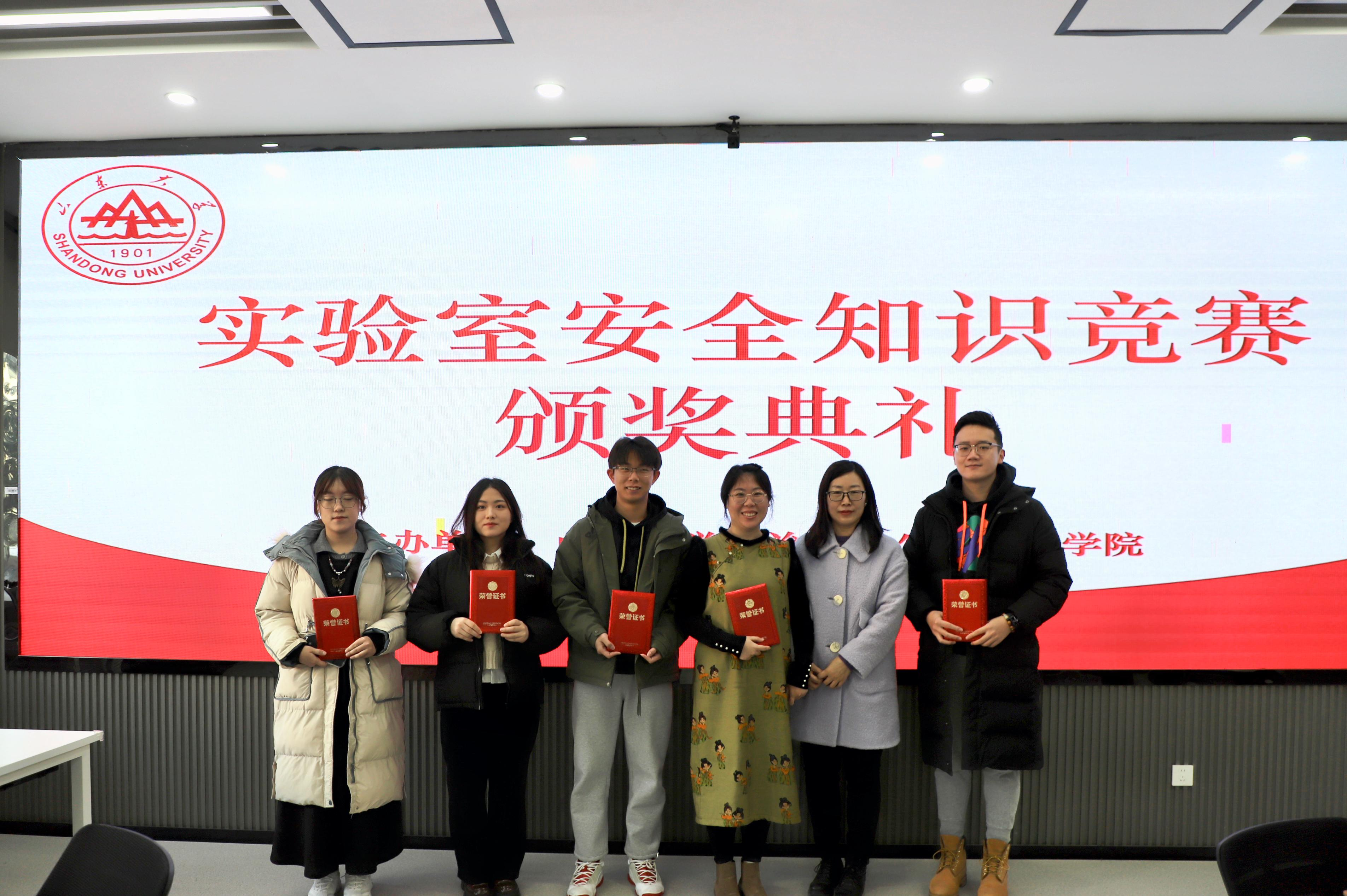 讲座结束后的“实验室安全知识竞赛”颁奖环节,学院党委副书记马桂兰、副院长赵婷、实验教学中心副主任费立国分别为获得一、二、三等奖的师生颁奖。颁奖结束后,马桂兰和赵婷做了总结,对活动的顺利开展表示了祝贺,希望全体师生在今后的工作中保持安全意识,遵守安全规章,牢记安全守则,熟悉安全处置方法。