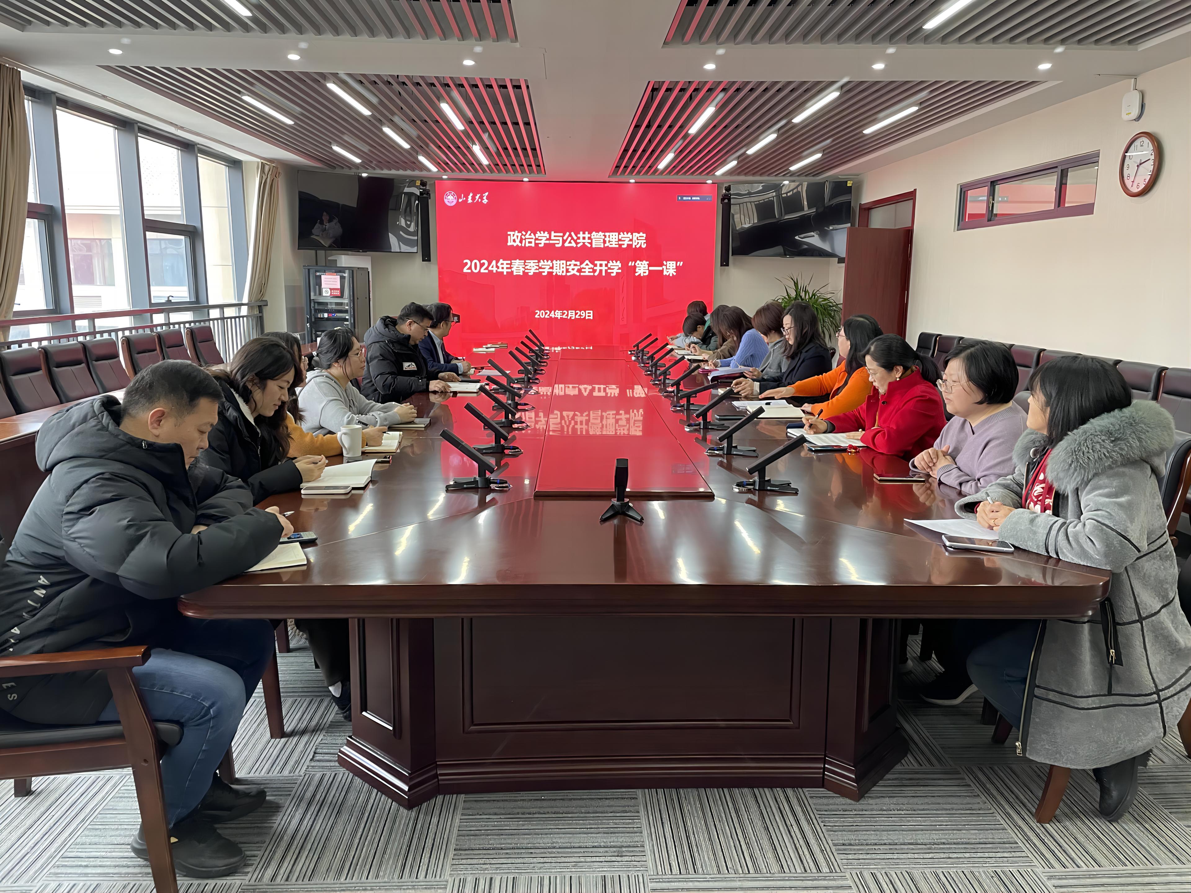 在华岗苑南436会议室开展2024年春季学期安全开学“第一课”。学院院长马奔、党委书记李海燕出席会议并讲话,学院党委副书记石莹主持会议。学院全体行政人员参加会议。