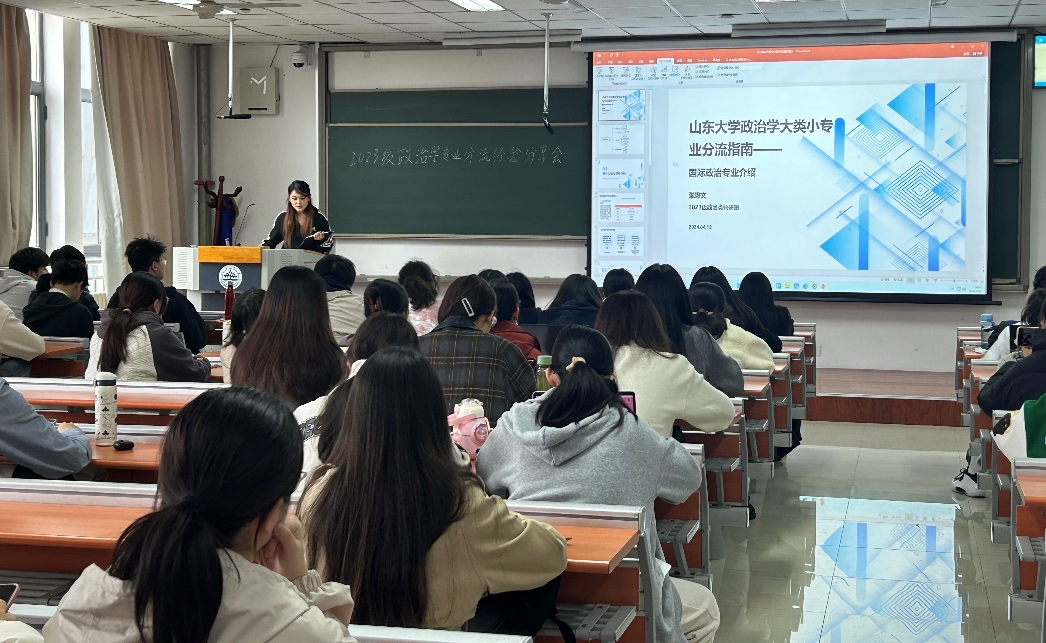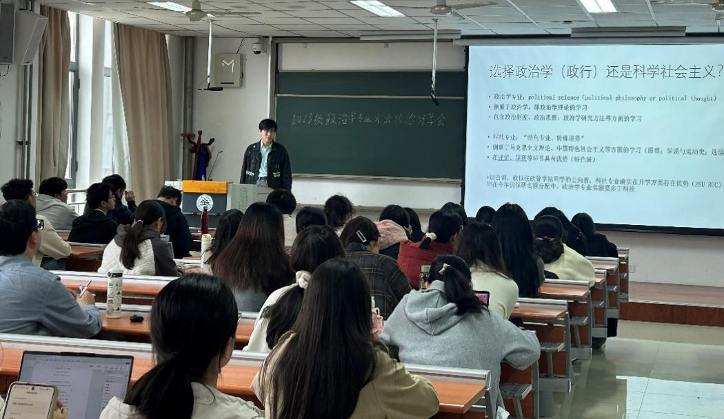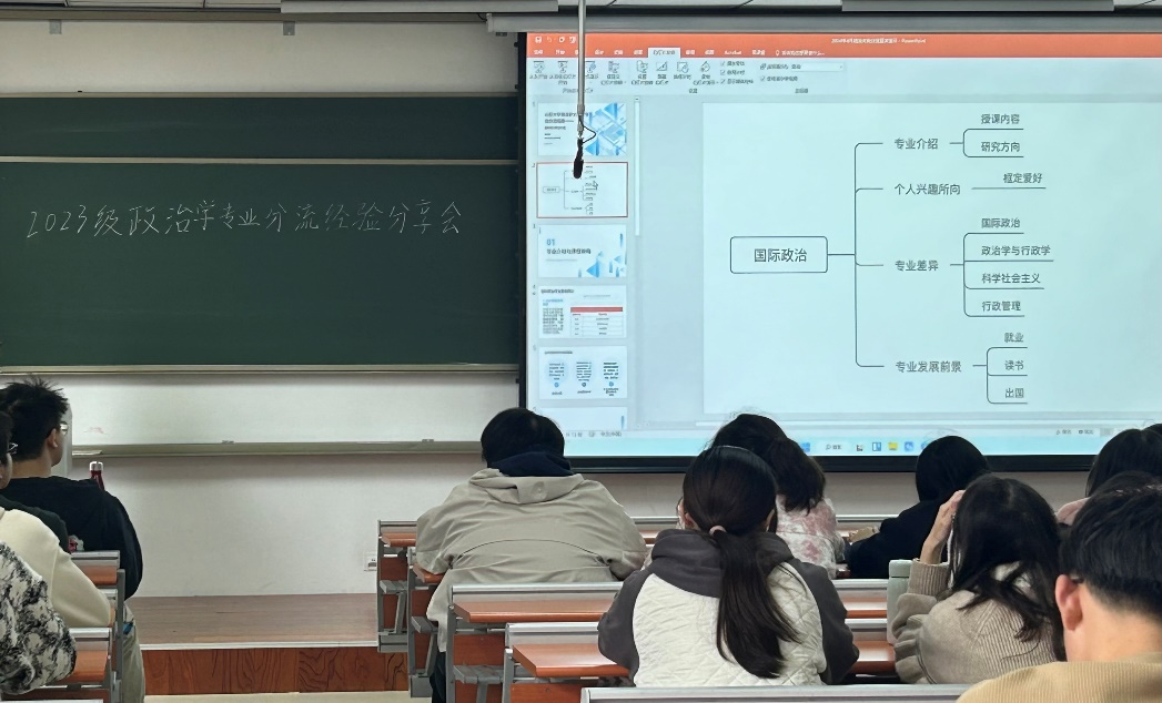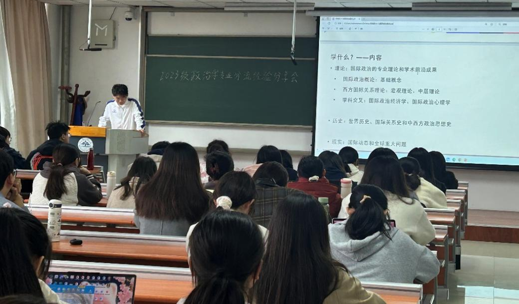 2023级政治学专业分流经验分享会于振声苑N302举行。分享会邀请6位来自政治学与行政学、国际政治和科学社会主义专业优秀的学长学姐进行经验分享,2023级政治学大类全体学生参与此次活动。