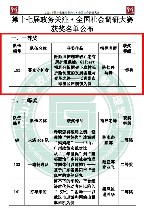 6月8日,第十七届政务关注·全国社会调研大赛全国总决赛在中山大学落下帷幕。在我院教师马奔、陈仁兴的指导下,由2021级本科生马婉婷、孙语悦、朱彦霖、夏思晓组成的“暮光守护者”队在来自全国包括中山大学、南开大学、厦门大学等在内的205所高校378支团队中,脱颖而出,荣获复赛调研报告第一名、决赛总成绩第一名(全国仅一名)的好成绩。