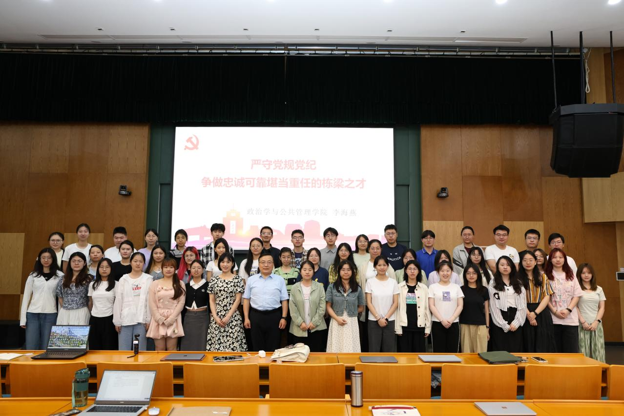 在党课的最后,李海燕向全体本科生党员介绍了院训“知政为公,厚德笃行”的出处与院徽的深刻含义,强调院训对于学院文化建设和师生行为规范的指导作用。对于即将毕业的党员,李海燕给予了深情的临别寄语。他希望毕业生党员能够牢记院训,将个人理想与国家发展紧密结合,努力成为“中国之治”的坚定执行者和探索实践者,为实现中国式现代化贡献青春力量。