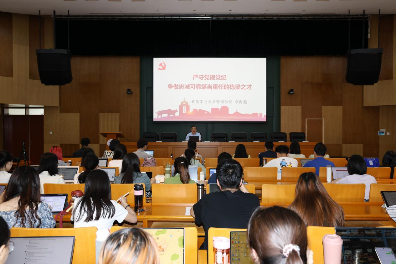 李海燕结合习近平总书记重要讲话精神,深入浅出地讲解了新修订的《中国共产党纪律处分条例》,结合生动的案例,全面阐释了党纪学习教育的重大意义。他强调,党员要筑牢理想信念根基,守住拒腐防变防线,贯彻党的群众路线。毕业生党员在新时代背景下要不断深化对理想信念的理解和追求,要深入群众,了解群众需求,切实解决群众的实际问题。同时要警惕各种诱惑,坚守道德底线,保持清正廉洁的政治本色,争做忠诚可靠堪当重任的栋梁之才。他勉励毕业生党员牢记“知政为公,厚德笃行”之院训,努力做“中国之治”的坚定执行者和探索实践者,奋力书写为中国式现代化挺膺担当的青春篇章。