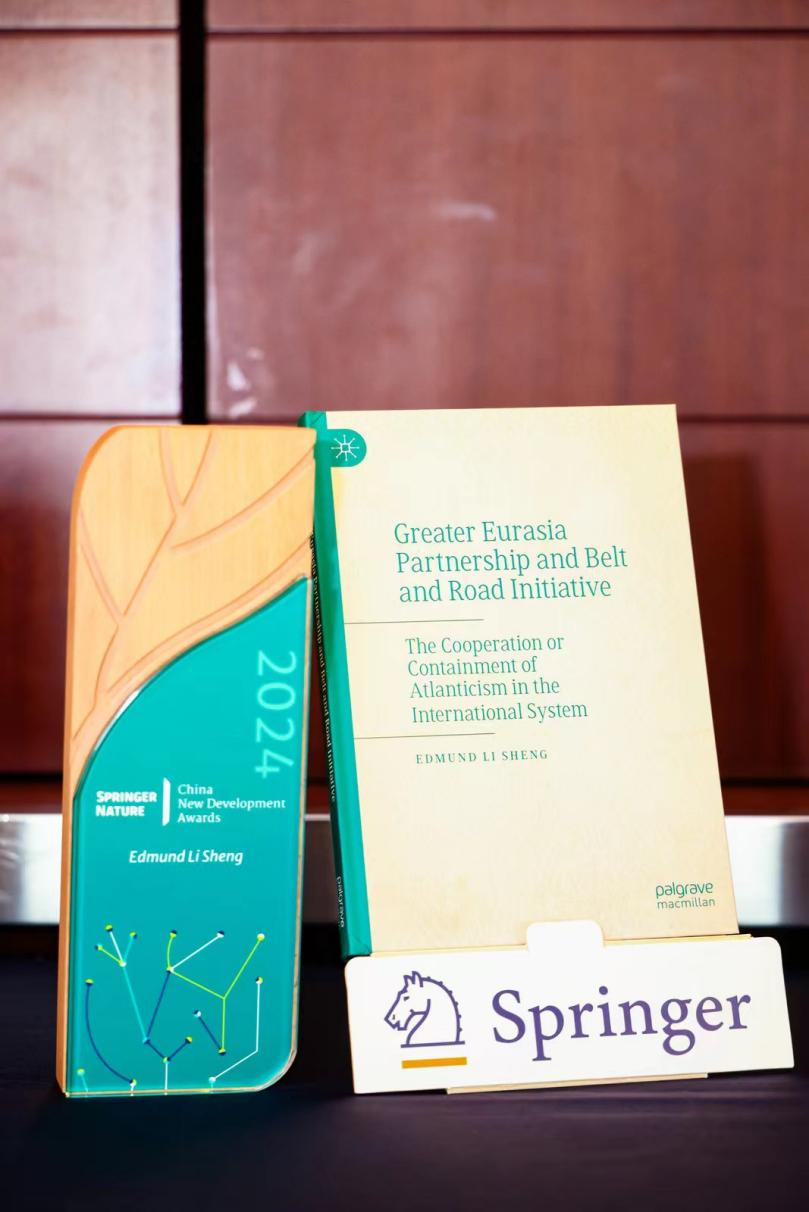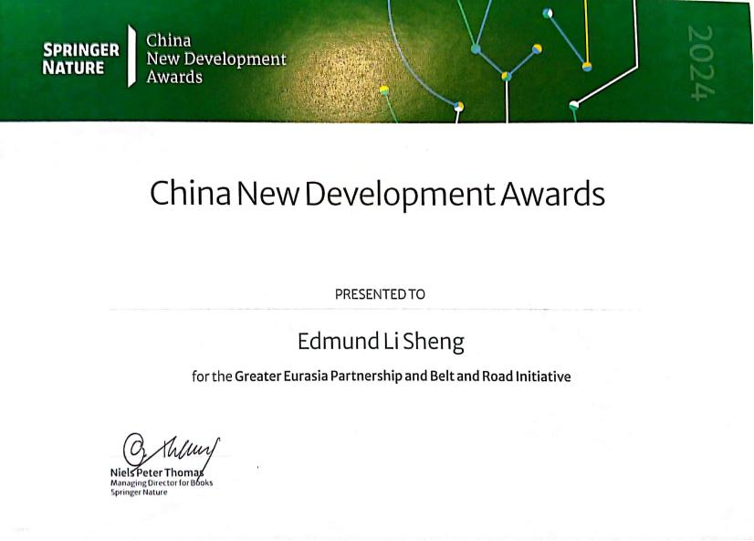 特聘教授盛力的专著《大欧亚伙伴关系与一带一路》(Greater Eurasia Partnership and Belt and Road Initiative: The Cooperation or Containment of Atlanticism in the International System)获奖。集团全球总裁Niels Peter Thomas博士为获奖者颁发奖牌和证书。国家新闻出版署领导和中外学术、出版界领军人士百余人出席盛会。