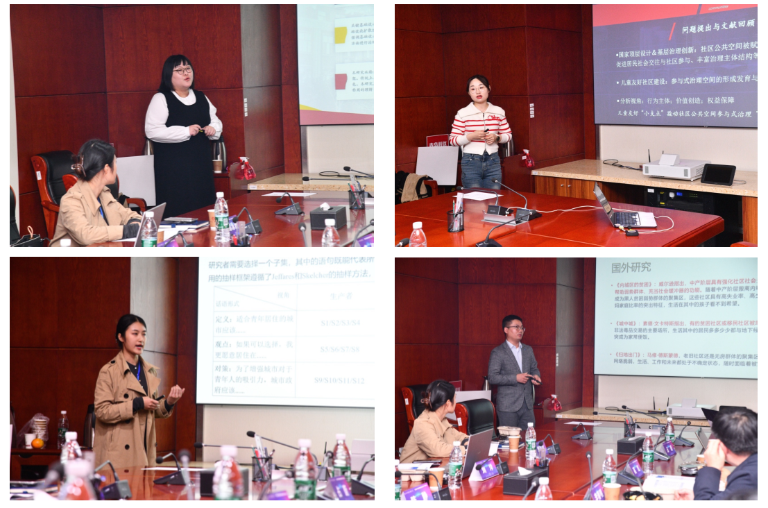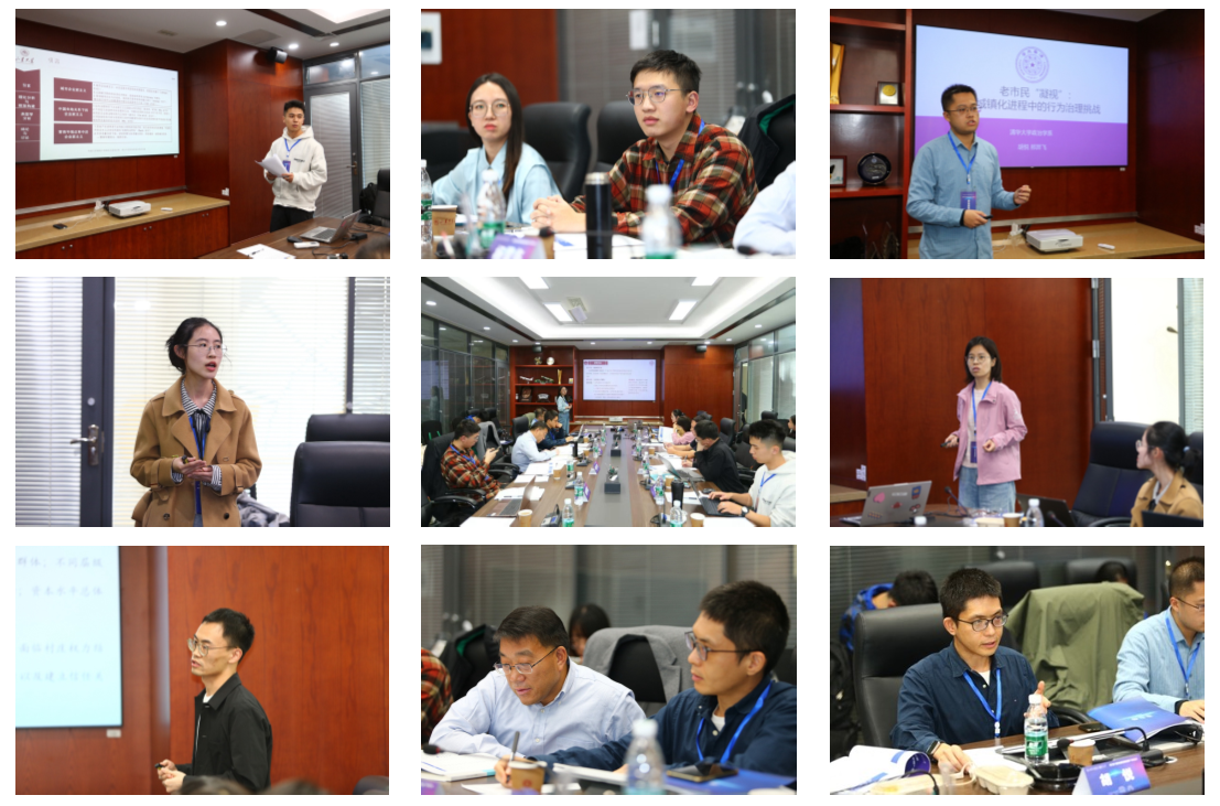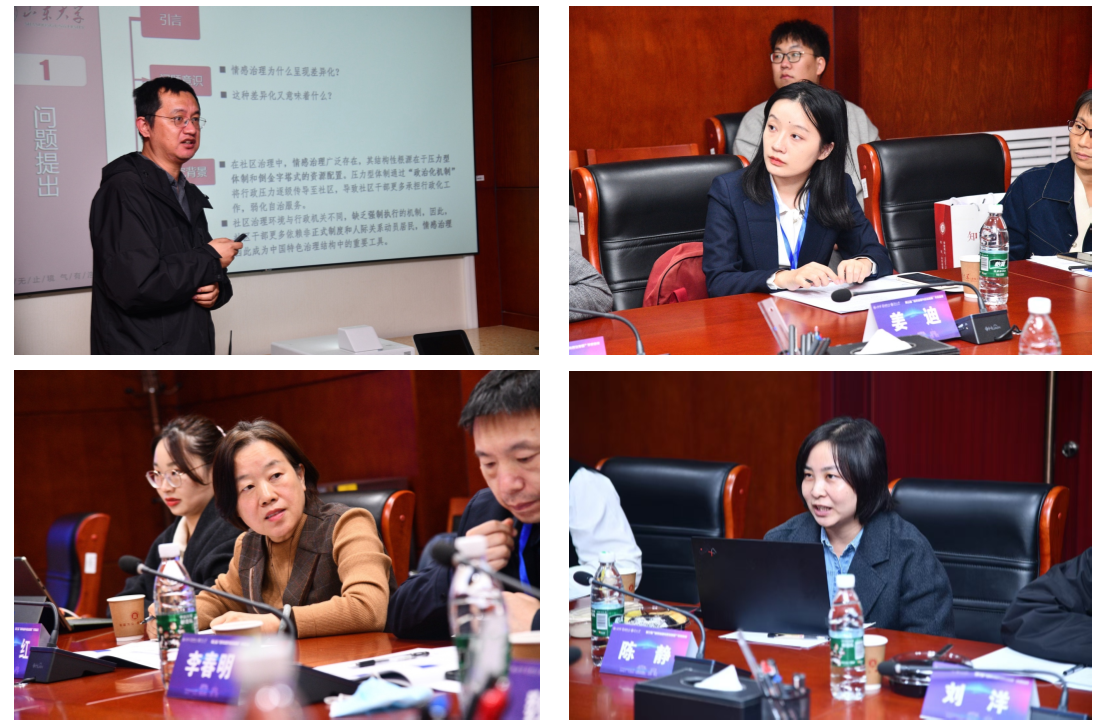 博士研究生叶沐青分享了企业家主义治理逻辑在营商环境改革中影响地方实践行动的机制;清华大学杨雪冬教授、清华大学硕士研究生胡天宇报告了有关决策者视角下城市工作重心转变的研究;清华大学胡悦副教授、清华大学博士研究生邢羿飞运用主观社会比较实验的方法,研究了新老市民身份在交往中的关系以及对社会治理的影响;南开大学博士研究生康炯慧通过分析G省的实践阐释了公共服务共同生产向价值共创的转化所需的三个递进阶段以及公共服务价值共创的驱动机制。中共山东省委党校张文翠老师、华南师范大学刘洋副教授肯定了上述选题的现实性,并就如何进一步完善研究进行了交流。中共山东省委党校张文翠老师讨论了地方政府在落实乡村振兴政策时,如何寻求上级指令贯彻与基层自主之间的平衡;南开大学博士研究生李宁卉对吹哨报道的现实表现与困境进行了深入讨论;华南师范大学刘洋副教授提出干部下沉的赋能过程主要在于组织建设、资源转化与政策执行。清华大学杨雪冬教授和胡悦副教授指出了现有研究的优缺点与完善方向。